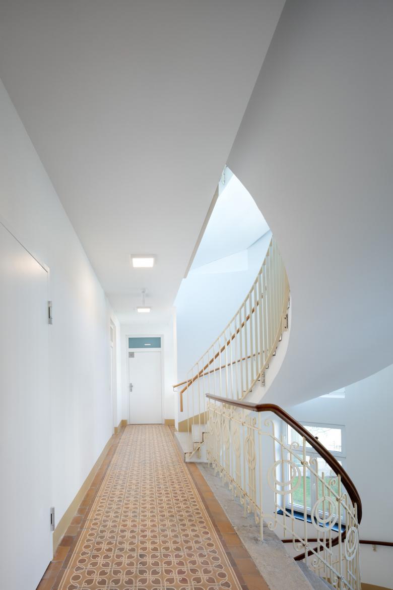 Sieben Wohnungen blieben gleich, die restlichen 28 wurden saniert und zum Teil zusammengelegt. Hinzu kamen neun weitere in den beiden neuen Obergeschossen. Die Anzahl der durchgesteckten Wohnungen beläuft sich nun insgesamt auf 36. Ihre Grundrisse variieren zwischen 40 und 102 m2. Hofseitig erhielten sie großteils Balkone bzw. Loggien, zwei vom Stiegenhaus zugängliche Loggien dienen der allgemeinen Nutzung. Durch eine Rampenanlage im Erdgeschoss und den nachträglichen Einbau eines Liftes sind alle Wohnungen barrierefrei erreichbar. Ein großzügiger Fahrrad- und Kinderwagenraum, eine Briefkasten-Durchwurfanlage, sowie ein Müllraum mit straßenseitigem Service-Zugang komplettieren den Wohnbau.