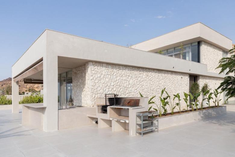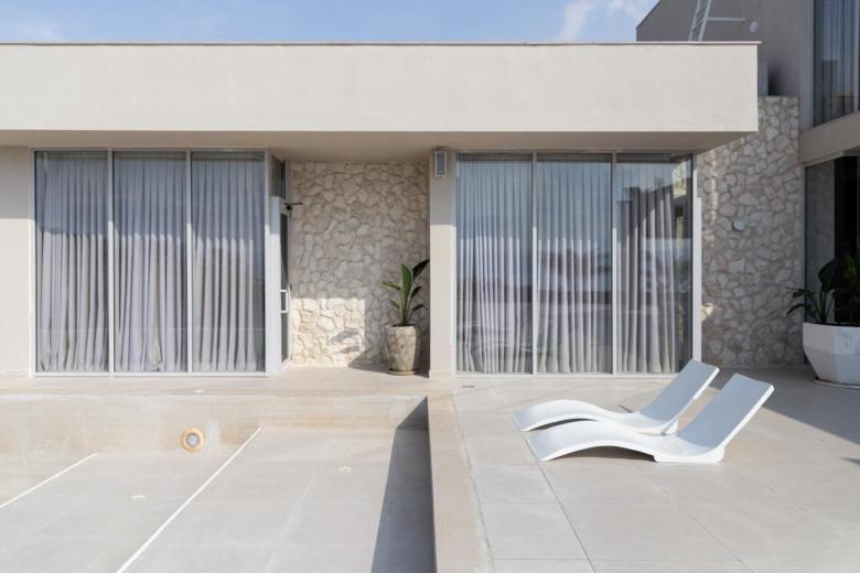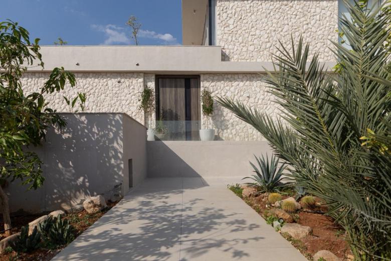 The architectural expression emphasizes a pure stone aesthetic, reflecting the earthy character of the region and grounding the house within its landscape. Natural textures and light-toned materials define the exterior, creating a calm and timeless presence.