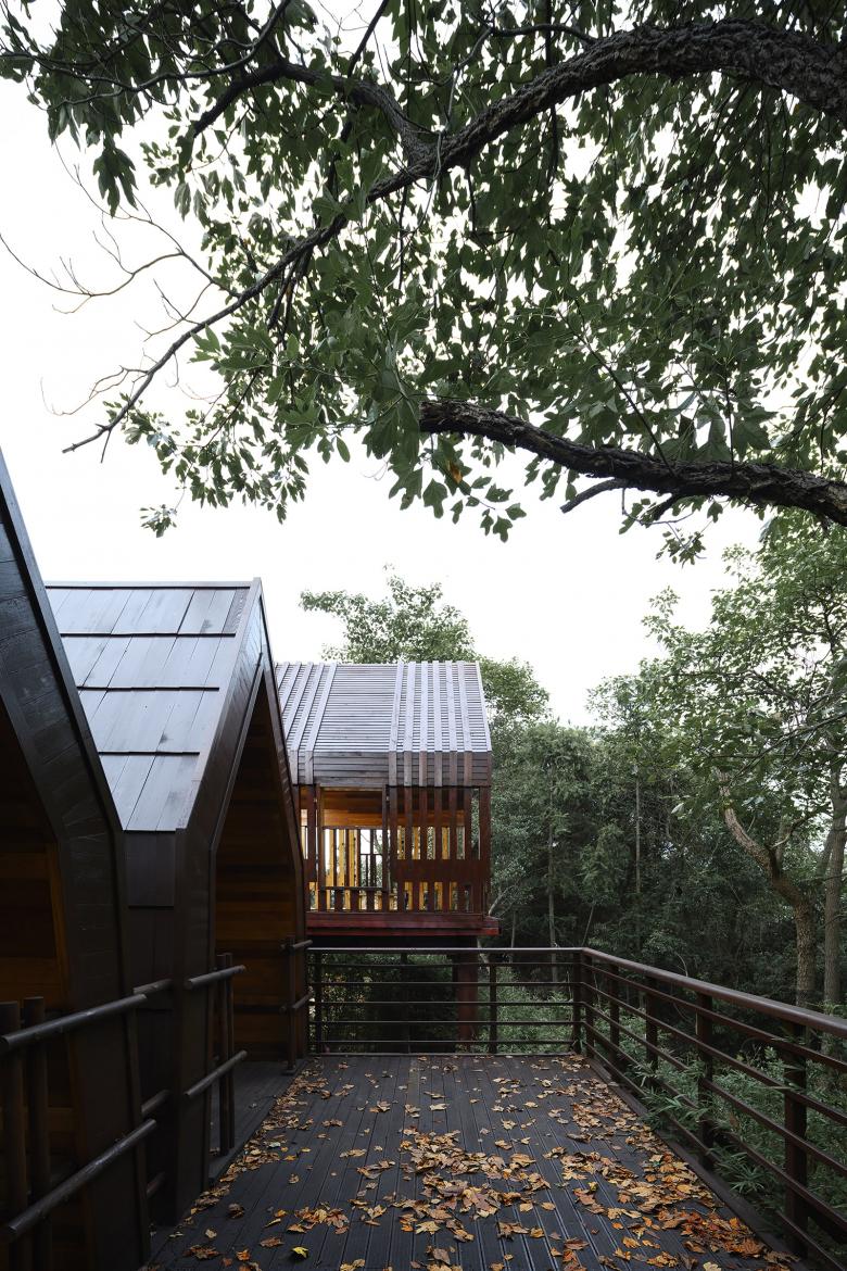 新建筑的中轴线空间,其余的建筑部分就像在植被的间隙中做一道填空题。也得益于这样的天然禀赋和设计方法,最终呈现的建筑反而充满呼吸感:3 种类型的小木屋模块嵌入到场地中,平台为适应地形而呈现出高低错落的节奏。我们决定了木屋的朝向与开口方式,使他们成为互相之间的取景框。小木屋主材采用防虫防腐处理后的洪雪松木,还暴露着原始的木制纹理。我们甚至不希望这里看起来像一座干净整洁的新建筑,而应该是材料与环境间已经持续数载的一场亲密对话。较为特殊的是,设计之初,这里的具体功能和可能引入的业态还未确定。因此,空间