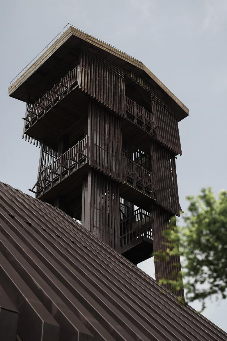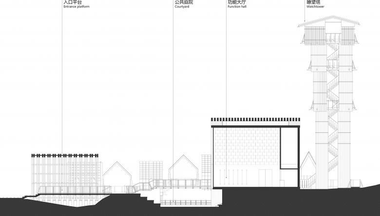 构想、罗列了这里可能植入的功能与业态,也作为木屋类型设计的一部分依据。“小镇”中轴上的多功能大厅造型上是小木屋的放大版,仿佛 3 种木屋模块未来功能延展的一张“使用导则”,也是“小镇”中唯一引入室内功能的空间。顶部天花木瓦斑斓下,有种道不明的仪式感。钢结构瞭望塔是整座岛屿的制高点,上大下小,可以眺望整个湖区。出于降低风阻考虑而设计的防腐木格栅立面,在不同的观察角度呈现出丰富多样的通透性:人们从湖面上游动的船只里望去,丛林中树立的高塔仿佛若隐若现,更添几分神秘感。日出日落时,阳光也从格栅缝隙间渗出。