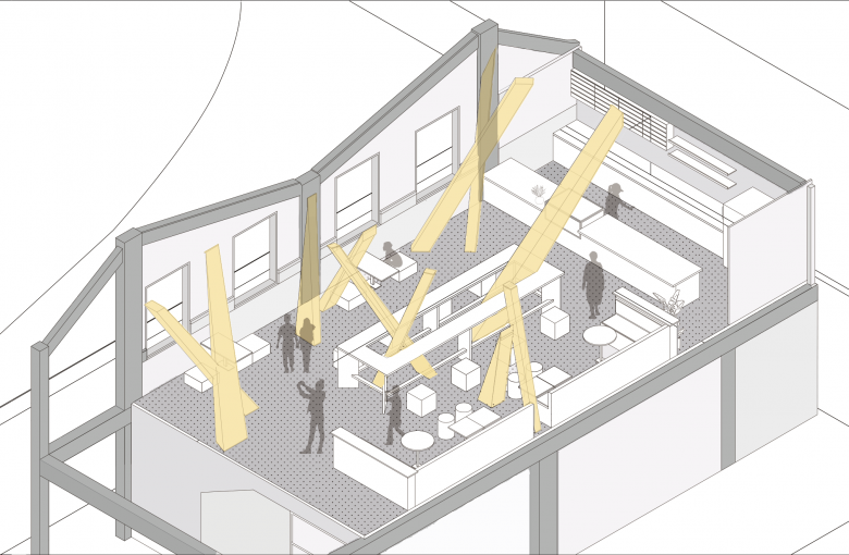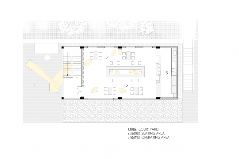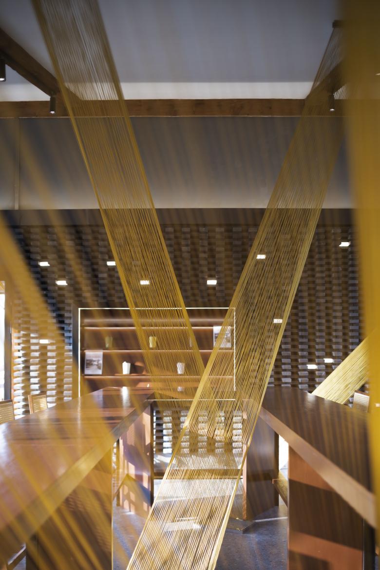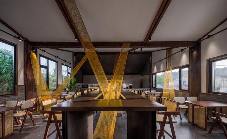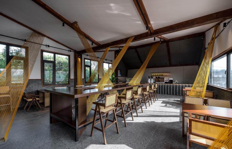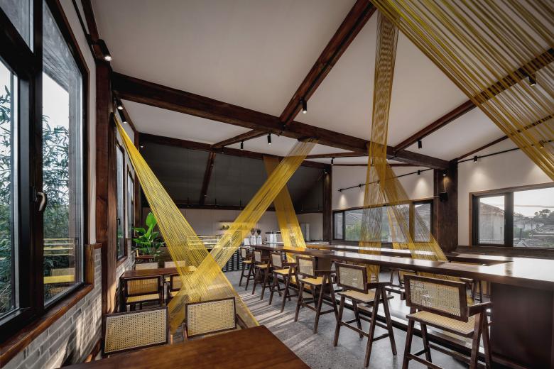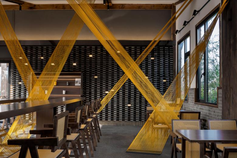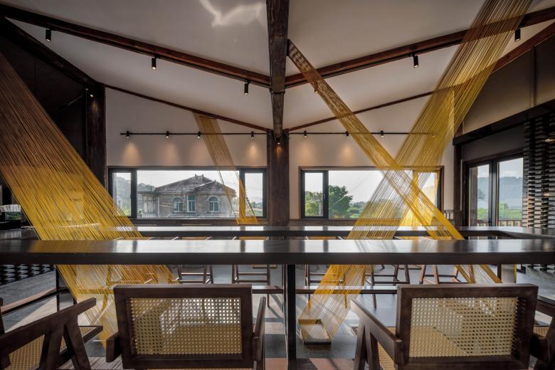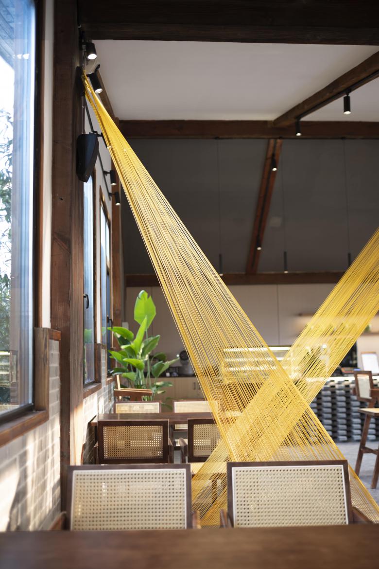不同于城市中的商业空间,本设计需要解读在历史片区中,如何协调驿站茶饮空间的商业性和古村历史的文化属性。咖啡馆在驿站的二楼,因此需要一个方法,为其进行商业引导。而对一楼的露天空间的利用,则是我们最终的选择。用尼龙线制作的光束形状装置,从二楼入口处延伸至一层的室外庭院,将视线的焦点汇聚到二楼的入口。