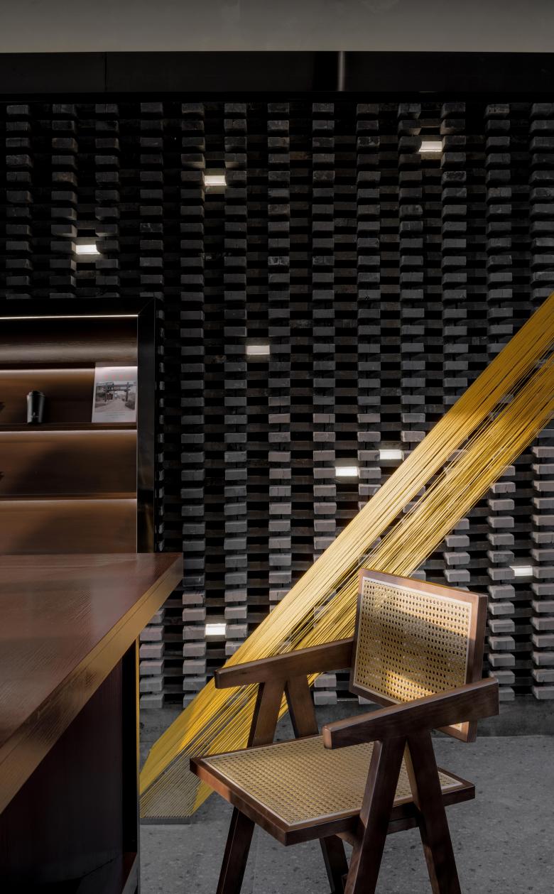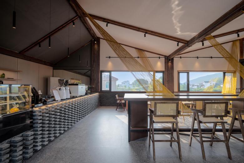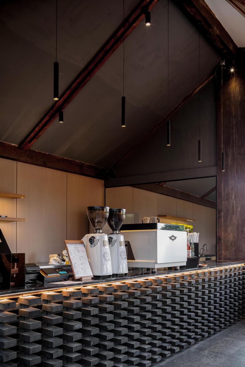 整栋建筑为木结构建筑,周围环境古朴幽静,同时店主也希望店铺的整体氛围能和古村落保持一致,因此在整体材质上我们选择了砖、木这类带有传统和自然特色的材质,来呼应场地的特殊性。天然胡桃木和深灰色砖材被用作室内空间的主要材料,带来一种和谐而充满美感的对比。胡桃木的温馨气息与灰色砖材相得益彰,后者为吧台和一层的墙壁带来独特的肌理,同时也为整个空间赋予了精致的细节及空间特征。