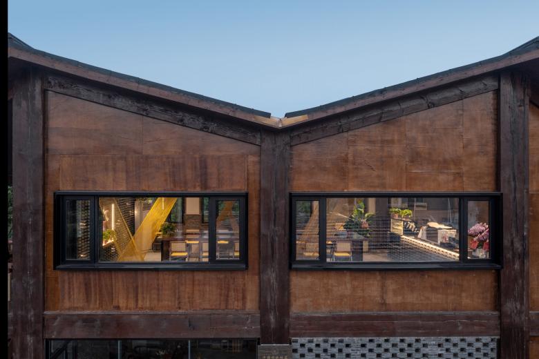 楼下蜿蜒而过的小河和雨后朦胧的远山,都为场景提供了优异的自然景观,因此对建筑的改造,通过将窗户调整为两个条形窗,用苏州古典园林的造园手法,将自然景观纳入室内。