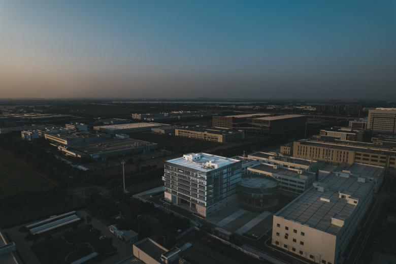 建筑所处区域多为低矮厂房及单一色彩外立面楼宇,缺乏现代化产业气息。为突显国方电子的高科技企业形象,借助玻璃幕墙、几何元素将办公研发大楼打造为具有立体感、画面感的区域独特风尚。研发办公大楼的空间分布巧妙而不拥挤,与周围建筑产生美感的摩擦碰撞的同时,又与厂房形成一种统一的韵味。设计师致力于打造和谐而富有独特美感的城市区域空间。