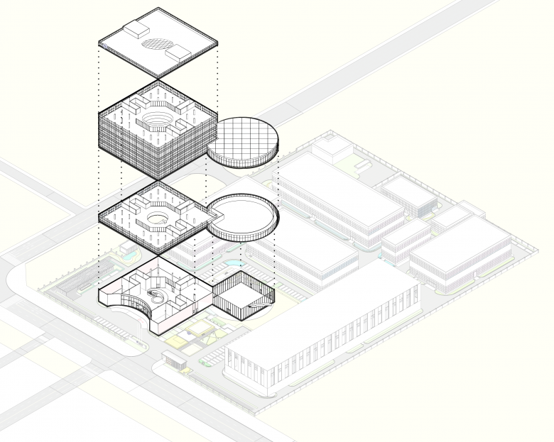从几何类型上,利用方形塑造出严谨、刚性、易读的属性;而圆是柔和、过渡、自然的。作为一个厂区配套办公建筑,方形位于地块拐角边界使建筑更易于增强城市地块界面感,圆形则作为休闲区域更偏向地块内向的自然和流动。从功能上,方形体量旨在容纳办公研发人员并进行企业文化展示,打造区别于车间的办公环境,圆形体量则是厂区内的人文、休闲的配套功能。