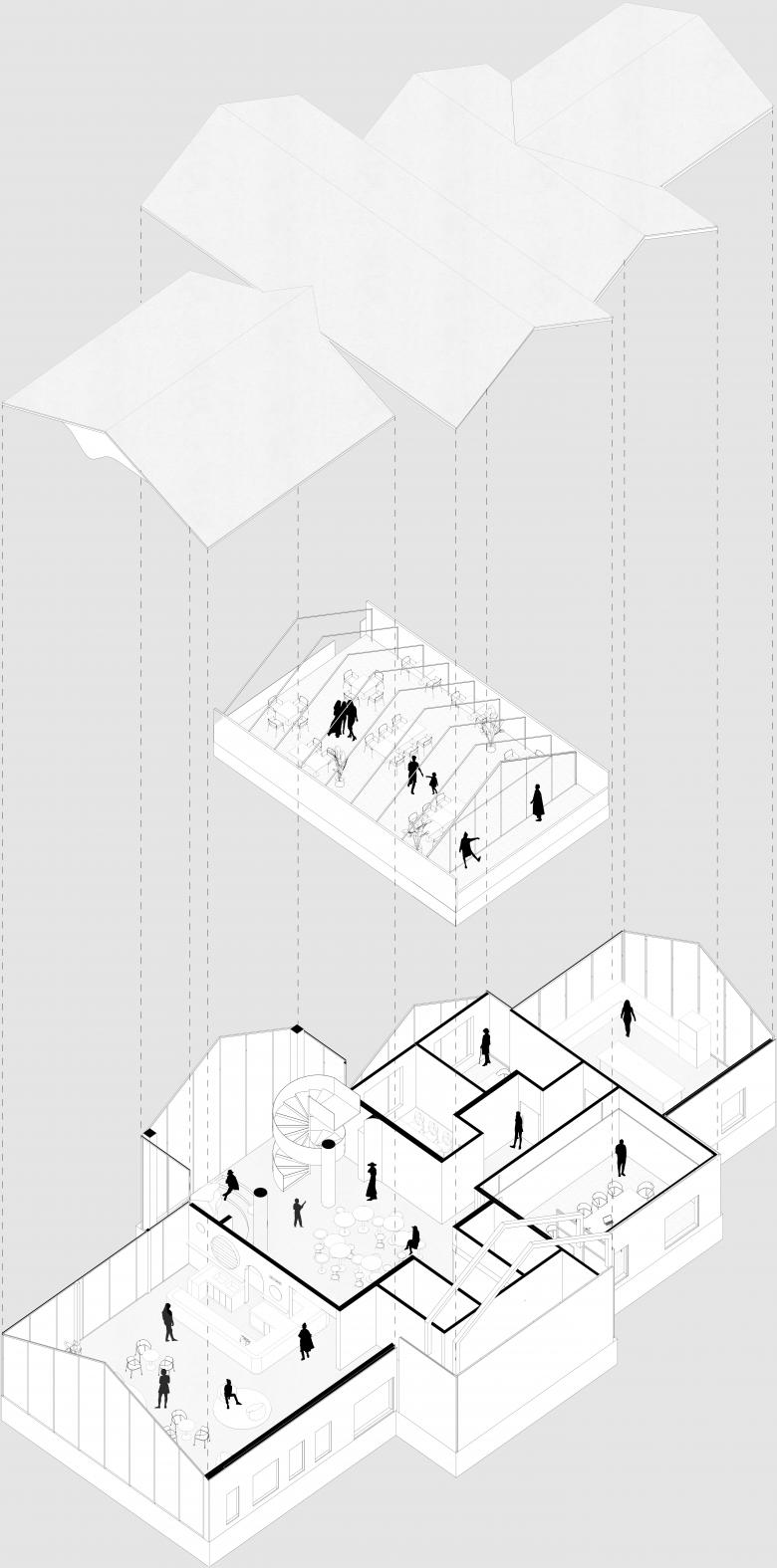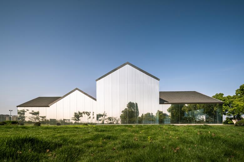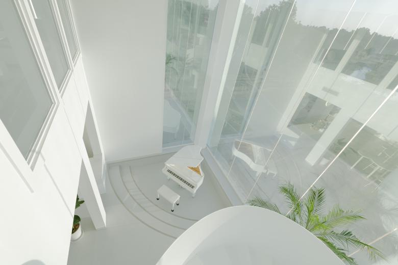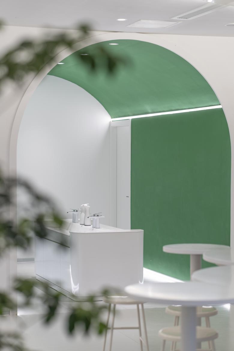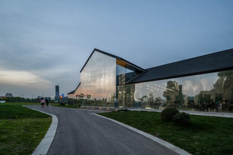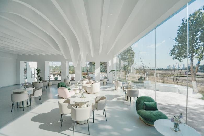 站在一座新城的角度去思考,公园里不可或缺的休闲配套其实是可以尝试更多可能性和想象力的,这种在公园里与大众紧密相关的配套建筑,大多仍处于完善基本功能需求的阶段,而其未来更多的可能性也是在这个层面上提升的,这样的改善表达的是所在城市的调性、关怀以及发展的态度与定位。作为设计师,我们想在太湖边做出一个有创造力并且能够成为公园区域性地标的建筑物,用简易的方式去设计和建造,让它能够提升城市公共空间的体验性,让人在公园中感到轻松与自然,让建筑尽可能融于环境。项目原是公园内的一处木质剪力墙结构的配套用房。 作为太湖新城的核心, 公园希望通过对原有建筑的改造,给予周边居民及外来游客服务的休闲聚集点。不论是在挥洒过汗水的运动后,还是在滨水漫步的午后,都可以在此休憩、用餐和聚会。形体的设计基于原有木制建筑的结构,错落穿插的体块生成了丰富的内部空间。白色的穿孔板与大面积的落地玻璃也被运用于设计中,形成了对内和对外两个不同的立面,一面朝向太湖,反射的效果令这个体量不大的建筑充分融入周围环境,让建筑映射人和城市的表情。一面朝向球场形成庭院,同时与公园以及场地建立紧密的关系。圆形地面的院子步道与金属球形雕塑作为最简单的主入口,简洁大方,符合LIM咖啡的品牌的主旨,在品赏美味之余,供访客合影留念。大面积的白色穿孔铝板,给人明亮轻松之感,引领来者进入馆中。阳光明媚,亦或是夕阳西下之际,单透镜面玻璃使建筑主体犹如湖边草地上的明珠,映衬着天空,云朵,花草,行人,别有一番韵致。建筑内休憩的人与外面流动的行人,相互映衬,互为画中。到了夜间,屋内灯火通明,它便是独一无二的独栋临湖酒吧。建筑一层包含了灵活有趣的开放空间,规模不同的包间,以及配套的厨卫后勤空间, 二层作为灵活布局,可举办不同的包场聚会活动。大厅内,结合原有木梁设计的白色波浪形状的吊顶,俏皮地倒挂在天花板上,映衬着窗外的天空和云朵,俨然生成了一幅画中画。灯光从挂片中打下,简洁高雅,营造出艺术的氛围。舒适的家具和地毯,提升了空间的品质,随意又不失精致感。自然摆放的二三盆绿植,有趣地点缀了这片纯白的空间。“建筑是凝固的音乐,音乐是流动的建筑。”走进下沉音乐区,白色雕塑感的钢琴优雅地矗立在旋转楼梯旁。琴键上缓缓流淌而出的音节,充斥着纯色的空间,引你驻足于此。此外,尺度适宜的包间也给来客提供了私密的区域,品质优异。二层简洁的线灯勾勒了完整保留的坡屋顶形态。大面的玻璃展现了窗外优美的风景,提升了空间品质。室外的院落区融进了天然的绿色场景中,仿佛在自然公园的卷轴上落下的神奇笔触,点点晕开,相连。圆形的外摆和吧台呼应着场地,呈现一幅自然艺术的图卷,引人驻足。晚间,明珠一般的灯饰点缀了暗夜,亮了院落。赏着夜色,人们在此聚集,畅谈。在这个飞速发展的时代,建筑设计总让我们急于进入高大上的豪宅里,逃离外面的喧嚣, 一关门就进入自己的小世界。公园作为一种媒介,能否把人从自己的空间里吸引出来,到城市里汇合,交流,互动呢?虽然基于原有结构的设计无法达到一个公园配套最佳的示范效果,但我们也不为此而感到遗憾,这也是对项目开发成本和时间考验的妥协。LIM咖啡希望凭借优雅大气的外观设计和有趣的内部空间布局为大众创造一个公园汇合点,增强人与人之间的互动,聆听彼此,创造更多的可能性。傍着碧波荡漾的太湖之水,依着郁郁葱葱的绿树青植,隐于生态体育公园的一隅。约上几个友人,在此休闲郊游,看花、漫步、望湖、锻炼,真不失为人间乐事。