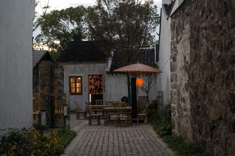 前院空间原是建筑的厅堂,倒塌后形成了较为开阔的院落空间,现在作为酒馆的的外摆区。