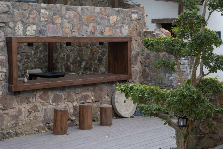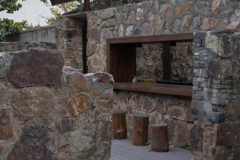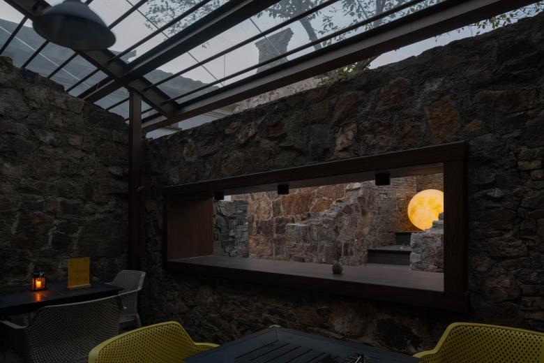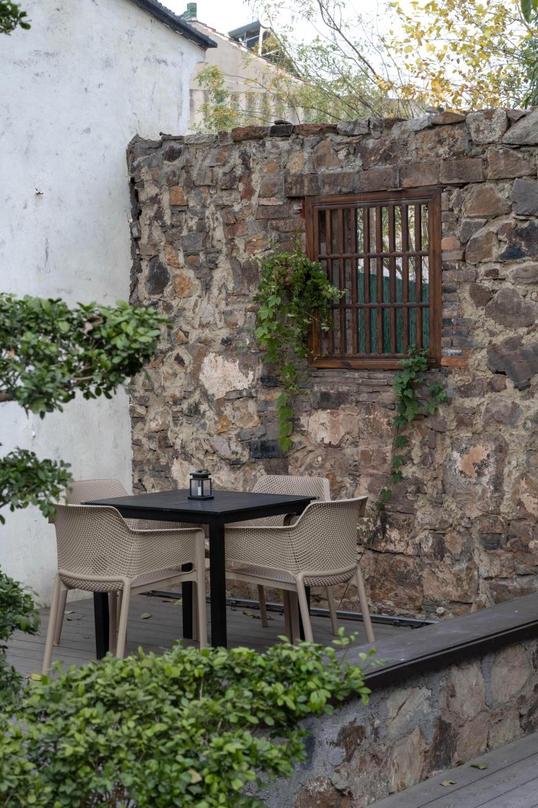 我们在保留后院遗存的黄石墙垣的基础上,增加了平台、阶梯、座椅等元素,以满足酒馆业态的使用需求。新业态的植入使这片废墟重获新生,让遗迹不再是仅供观看的展品。