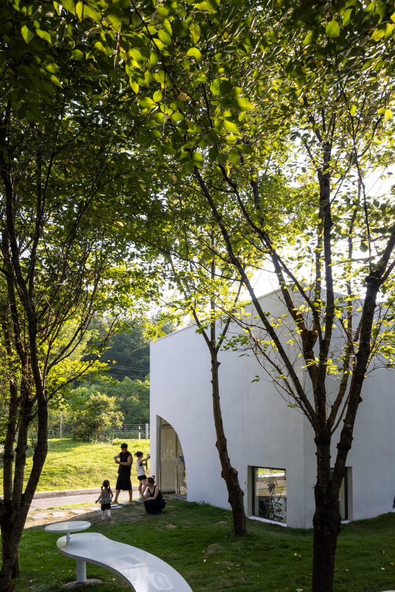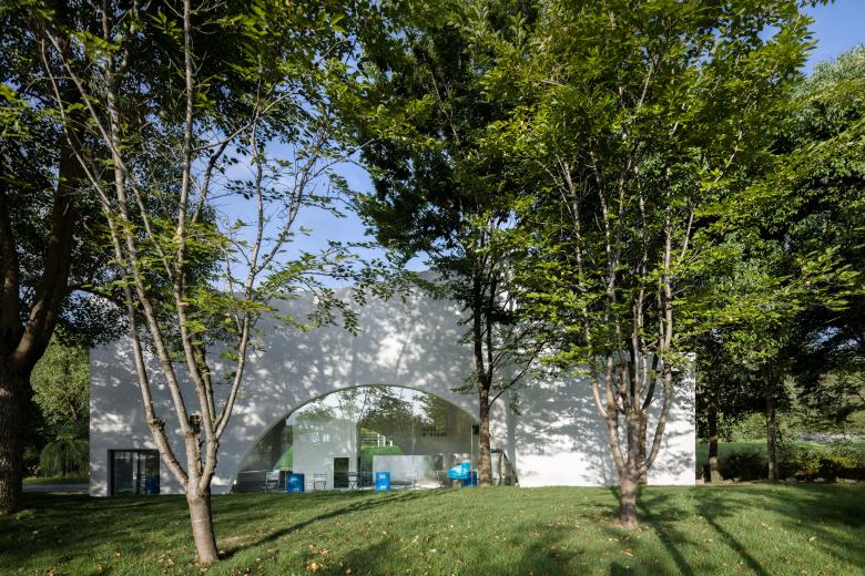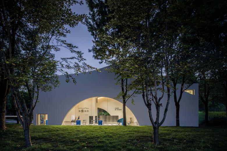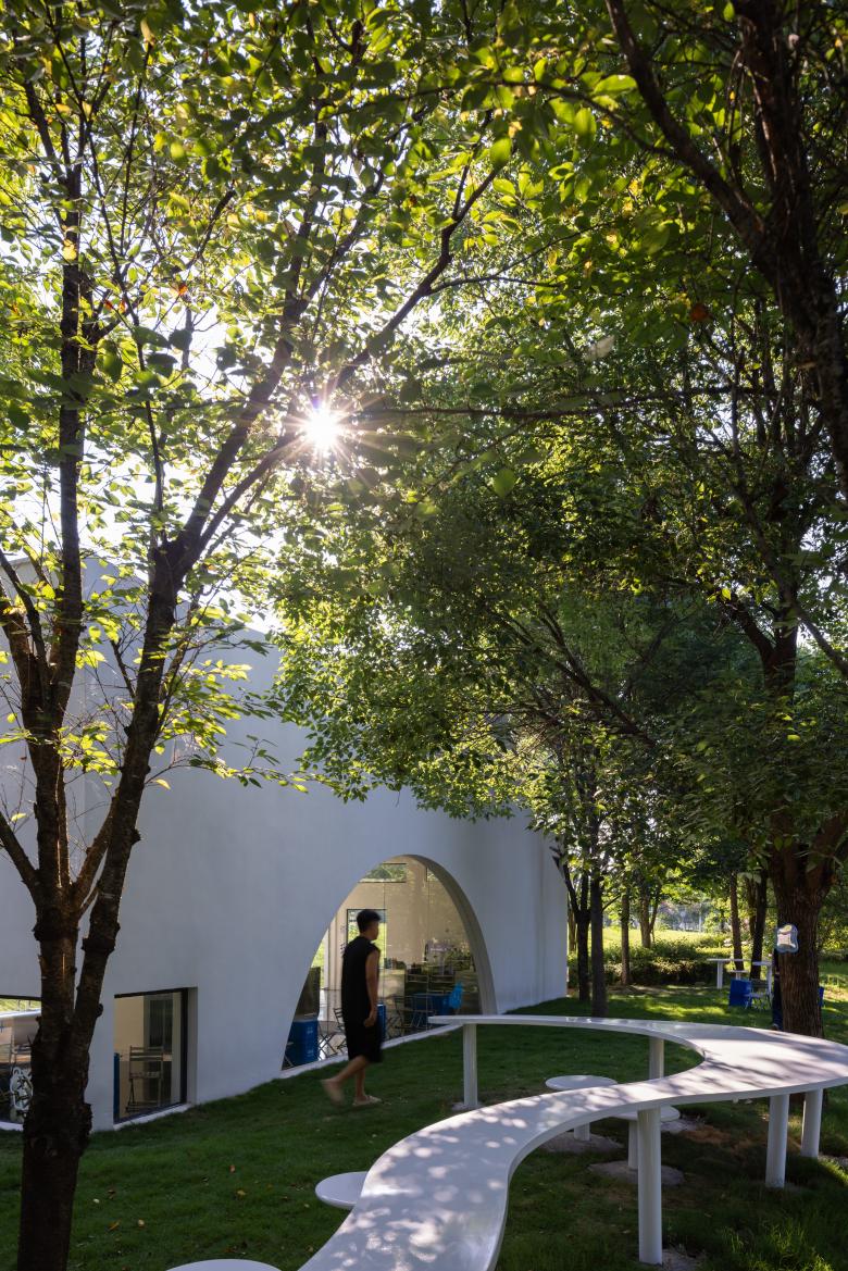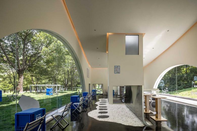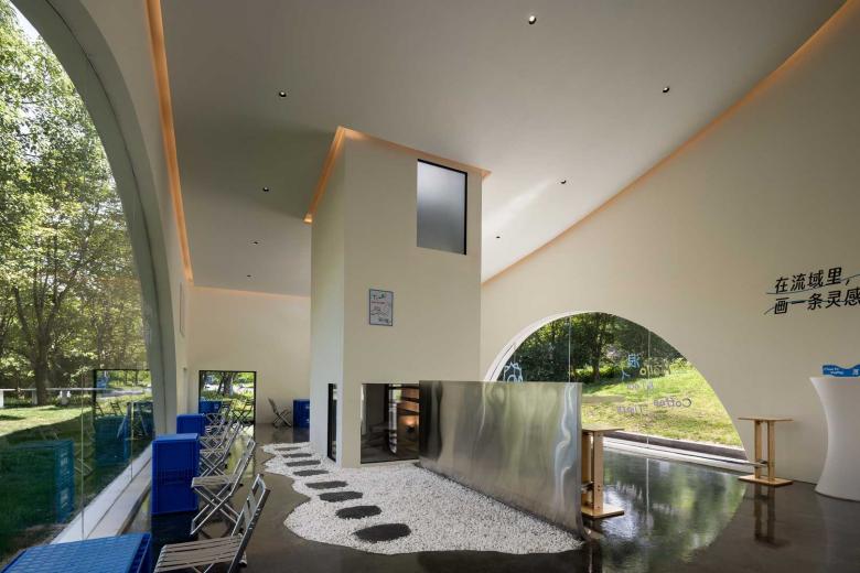 Architectural and interior design are unified under the theme of "fluidity." The external façade features curved floor-to-ceiling windows and folded walls, echoing the ripples of the stream while reducing the building's visual impact on the natural environment. The layout unfolds in a semi-enclosed manner around the central "Drifter Tower," with multiple openings guiding airflow and sightlines to enhance spatial transparency. Indoors, a language of frames and curves defines the space, with ceilings adopting continuous arched forms and embedded lighting strips to evoke the shimmering effect of water reflections.