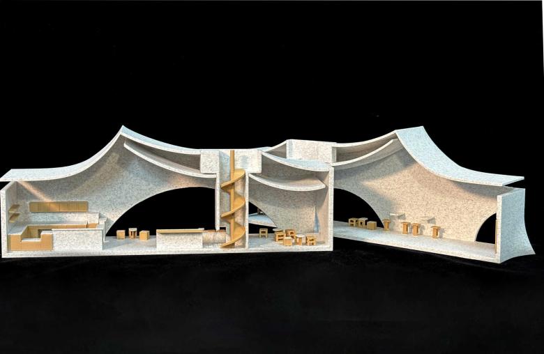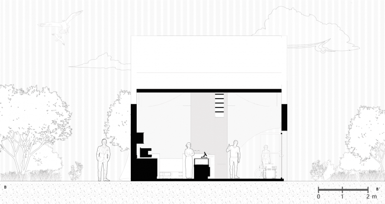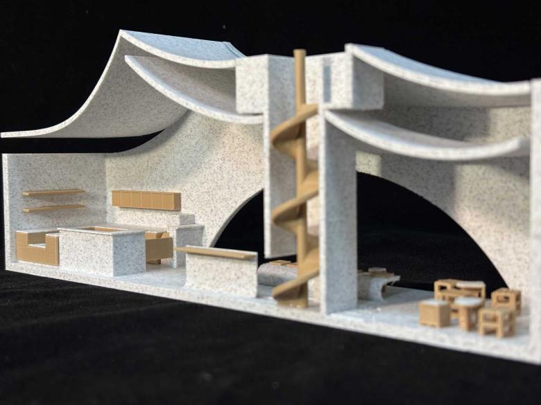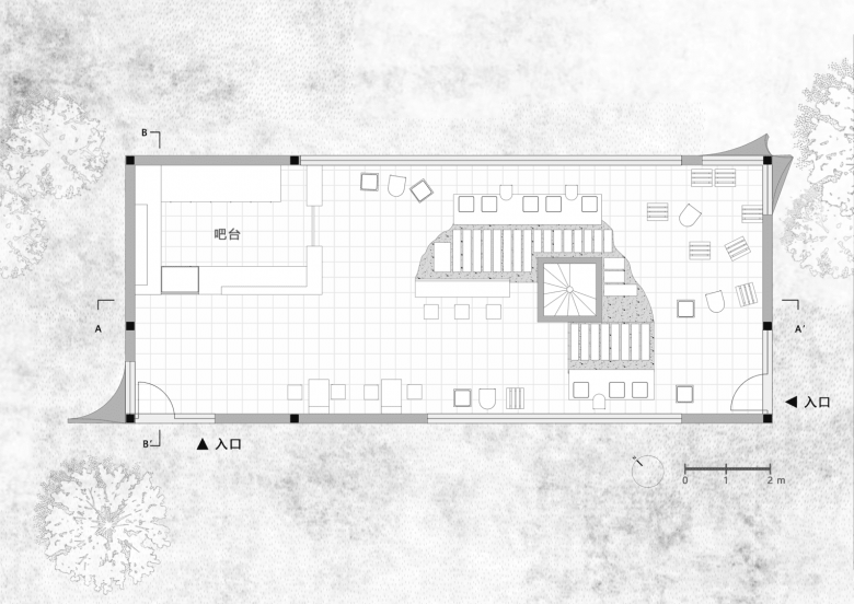 At the heart of the space stands a functional art installation: the Drifter Tower. Constructed from a composite of steel structure and reclaimed bricks, the tower rises approximately 7.5 meters high and integrates a rainwater harvesting system for plant irrigation and sanitary use, embodying ecological sustainability. Its winding staircase evokes the local legend of “ascending to immortality” in Xianju while blurring the boundaries between indoors and outdoors. Upon reaching the summit, visitors can overlook the panoramic stream views, experiencing both a topographical and spiritual elevation.