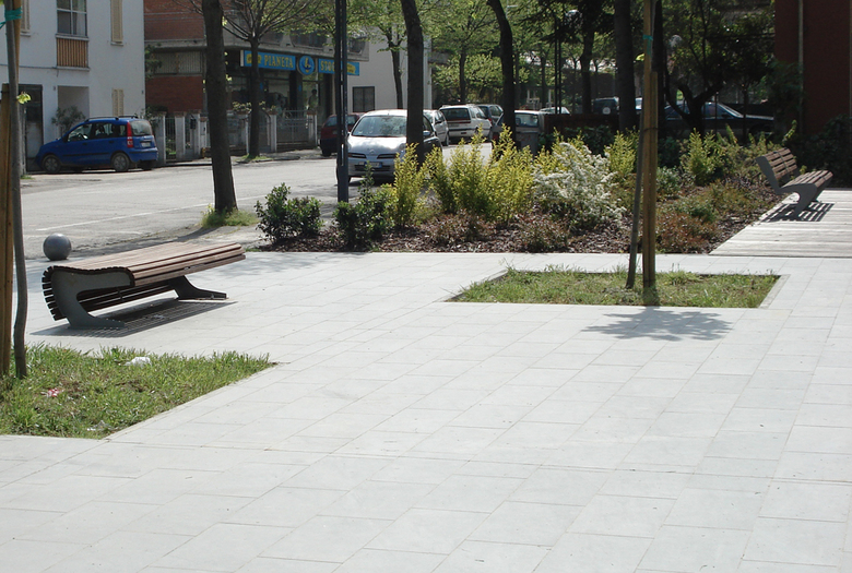 La composizione spaziale di piazza e giardino non rende manifesta la presenza del parcheggio sottostante: è pensata come un’alternanza ritmica di settori di forma essenziale, che si susseguono lungo l’asse pedonale, con materiali, texture, luce diversi. Alcuni settori sono assolati, aridi, altri bagnati dall’acqua, altri sono a semplice prato, altri hanno alberature isolate, vibranti d’ombre.