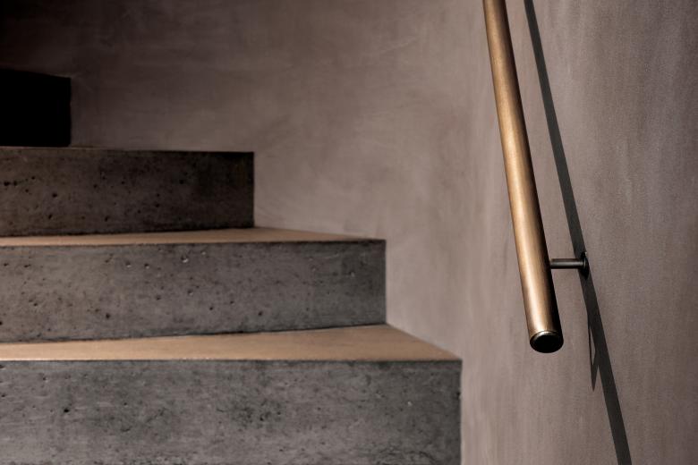 Natürliche, geerdete Materialien bestimmen das Bild auch innen und schaffen eine bodenständige und behagliche Raumatmosphäre. Die unteren drei Geschosse bilden aus edlen Materialien ein neutrales, helles und zurückhaltendes Umfeld. Der Dachraum öffnet sich dagegen besonders definiert und kraftvoll. Unbehandelte Tanne für Böden, Fenster, Türen und Möbel, handgearbeitete Terrazzoflächen sowie handwerklich hergestellte Kalkputze bestimmen das Bild. Auf die Farbe des Betons abgestimmtes, brüniertes Messing und handgearbeitetes Glas ergänzen die handwerkliche Materialpalette und geben dem Haus die gewünschte Beständigkeit.