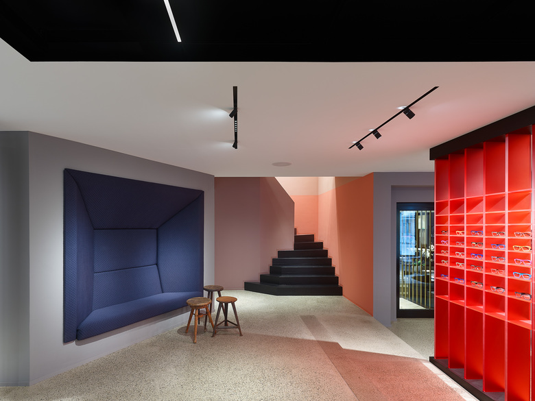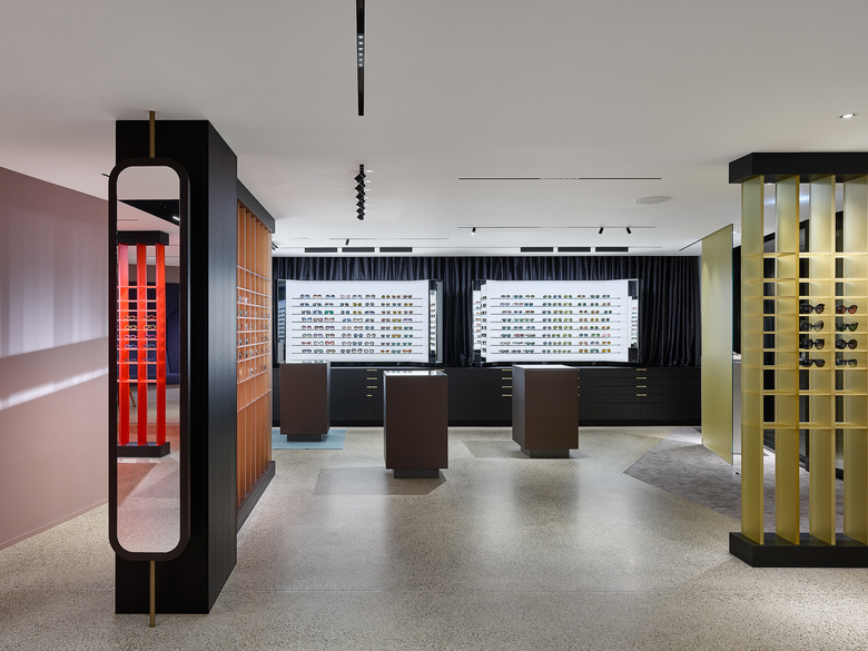 Im Optikbereich sorgt ein sorgfältig platziertes System aus schmalen, schwarzen Deckenkanälen mit Stromschienen für eine optimale Flexibilität bezüglich der unterschiedlichen Beleuchtungsanforderungen. Eine Kombination aus blendungsbegrenzten Downlights (Verkehrswege), Wandflutern (Wandauslagen) und lichtstarken, linearen Leuchten (Beratungstische) sorgt in Kombination mit ausrichtbaren Strahlern (Regale und Tische) für eine harmonische, blendungsbegrenzte Lichtstimmung.