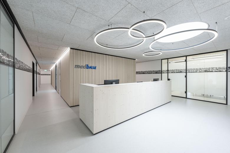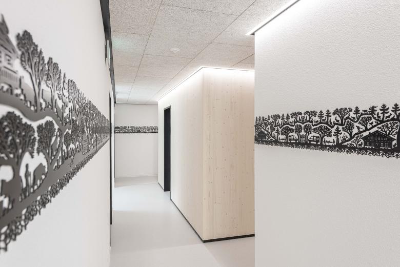 Am Standort Zweisimmen wird in der Praxis von Medbase eine Kunstform in den Fokus gerückt, die typisch ist für das Berner Oberland: der Scherenschnitt. Ein solcher zeichnet sich hier als schwarzes Band an der Wand ab. Bestehend aus gelasertem Edelstahlblech respektive Glasdekorfolie misst das dekorative Werk insgesamt eine Länge von fast 40 m. Die Vorlage für den Scherenschnitt lieferte ein lokaler Künstler Ueli Hauswirth, der sich von alpenländischen Motiven, aber auch vom Thema Gesundheitswesen inspirieren liess. So finden sich zwischen Gämsen und Chalets auch Krankenwagen und Verletzte auf Tragen wieder. Eine weitere gestalterische Besonderheit in der Praxis sind die Oberflächen in Tannenholz, die ebenfalls eine Brücke zu Natur und Alpenland schlagen.