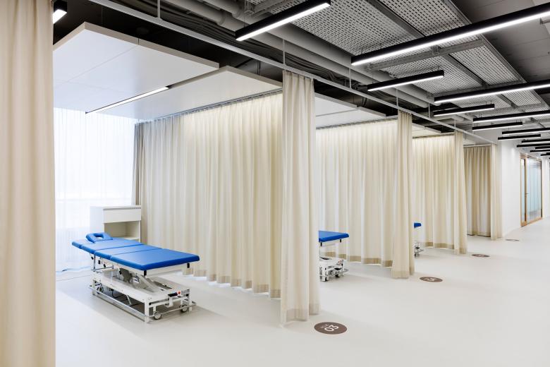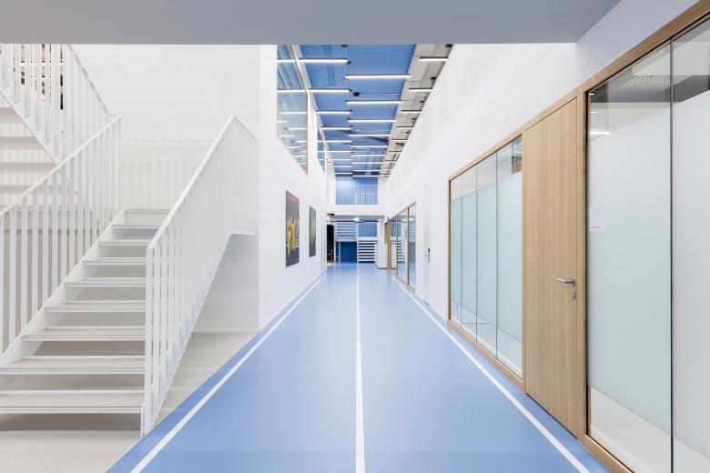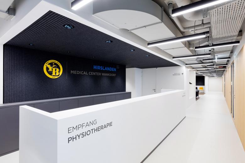 Dass es sich bei dem Bauprojekt um eine Kooperation zwischen Hirslanden und dem Fussballverein BSC handelt, wird durch eine entsprechende Farbgestaltung sichtbar: Ein Band in Blau (CI-Farbe Hirslanden) – unverkennbar die Reminiszenz an eine Laufbahn – zieht sich an Boden und Decke quer durch das zweigeschossige Medical Center und verbindet dabei drei Bereiche: Physiotherapie, Radiologie und Sportmedizin. Das typische BSC-Gelb findet sich punktuell in Mobiliar, Türen und grossformatigen Bilder mit Fussballmotiven wieder.
