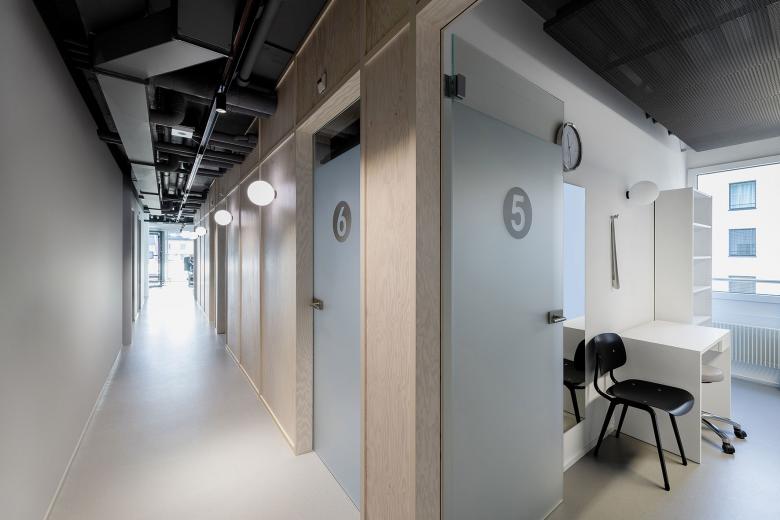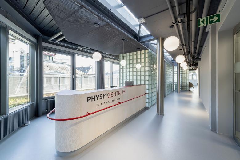 Das Motiv „Schiff“ wurde im Inneren der Praxis weitergeführt: So ist beispielsweise der Handlauf am Empfangstresen wie eine Reling ausgebildet, und die runde Folienbeschriftung an den Türen der Behandlungszimmer zeichnet kleine Bullaugen nach. Der graue Bodenbelag aus Kautschuk, Glasbausteine sowie Elemente aus Streckmetall, die die Kältesegel an der Decke kaschieren, schaffen einen technisch-kühlen Grundcharakter der Räumlichkeiten. Wärmere Töne werden hingegen durch die Wände aus weiss lasierter Seekiefer angeschlagen. Zudem setzen Kugelleuchten – ein Novum in den Praxen des Physiozentrums – einen dekorativen Akzent.