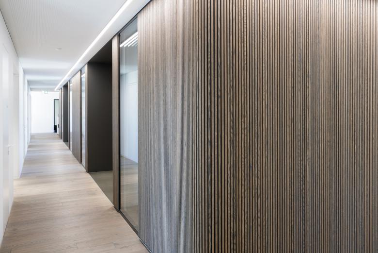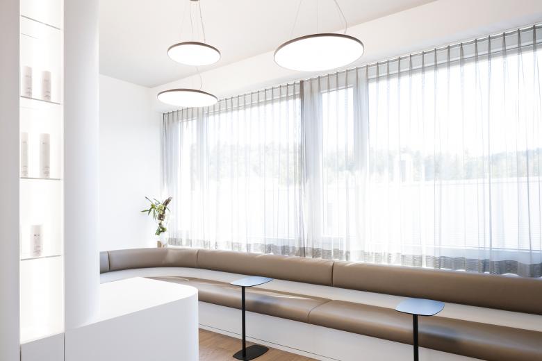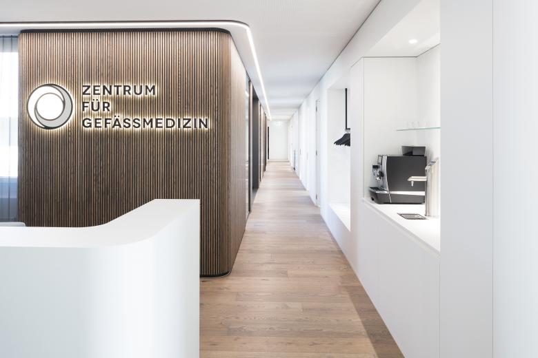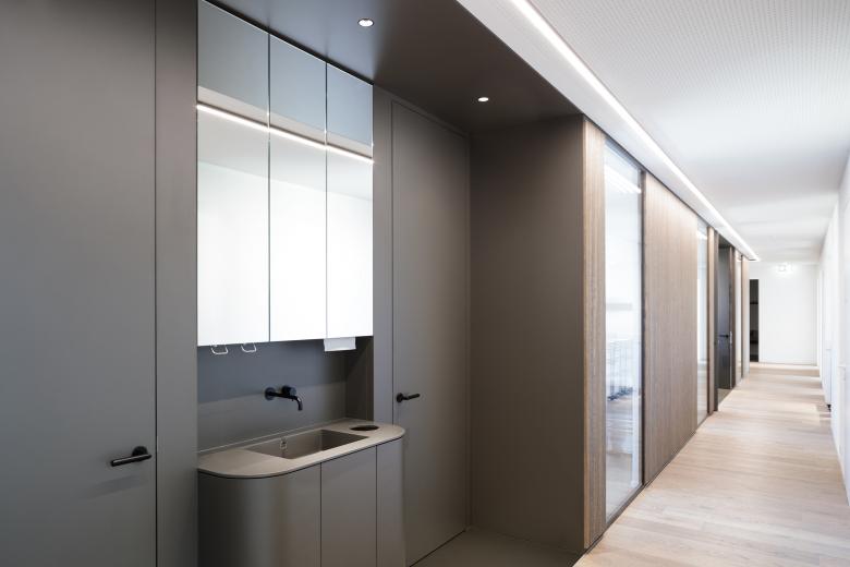 Die Praxis für Angiologie in Baden-Dättwil ist einer von vier Standorten des „Zentrums für Gefässmedizin“ und befindet sich im Attikageschoss eines u-förmig angelegten Gewerbebaus. Dieser verfügt zwar über viel verglaste Fassadenfläche, bietet dafür aber nur eine geringe Raumtiefe. Um trotzdem ausreichend viele Behandlungsräume für vier Ärzte generieren zu können, wurde ein Mittelgang angelegt. Von diesem gehen beidseitig Zimmer ab, die in ihrer Fläche so klein wie möglich dimensioniert wurden. Platz konnte vor allem dadurch eingespart werden, indem man darauf verzichtete, in jedem der Untersuchungs- und Behandlungsräume einen eigenen Waschplatz einzurichten. Stattdessen befinden sich im Gang zwei offen zugängliche Nischen mit Lavabos. Schöner Nebeneffekt: Durch die Nischen wird der lange Erschliessungsgang optisch aufgebrochen.