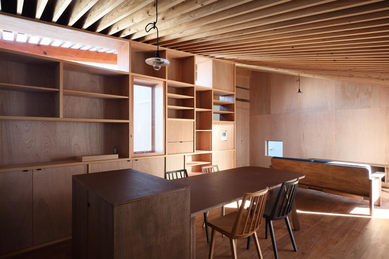 比較的自律した暮らしを営んできた老夫婦がそれぞれの暮らしを展開するための離散的住居を提案しています。個室の間に屋根を掛け渡して、共用空間をつくります。家族が集まる求心的な団欒空間ではなく、個室と個室の共用の縁側あるいは路地のような「間の間」です。各自が個室に閉じこもるだけでなく、間の間を通じて適度な距離を保ち、互いを見守りながら寄り添って暮らすことのできる居場所を考えています。