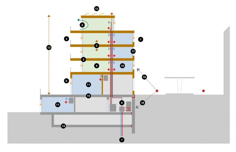 Die drei auf einem Sockel angeordneten Punkthäuser sind leicht von der Bahnhofstrasse zurückversetzt und führen das Raumbild der bestehenden Bebauungsstrukturen weiter. Die Gebäuderücksprünge kreieren einen Fächer von öffentlichen bis privaten Orten mit kleinen begrünten Plätzen und Zwischenräumen. Durch das niedrig gestaltete und ebenfalls zurückversetzte Bahnhofsdach bettet sich der Bahnhofsplatz gut in die Sequenz aus dorfcharakteristischen Vorzonen und Plätzen der Bahnhofstrasse ein. Zukünftig wird er nicht nur eine räumliche, sondern auch eine soziale «Scharnieraufgabe» im Dorfgefüge übernehmen. Der Strassenraum wird durch Baumpflanzungen begleitet, die eine verkehrsberuhigende Massnahme bilden und sich positiv auf das Mikroklima auswirken.