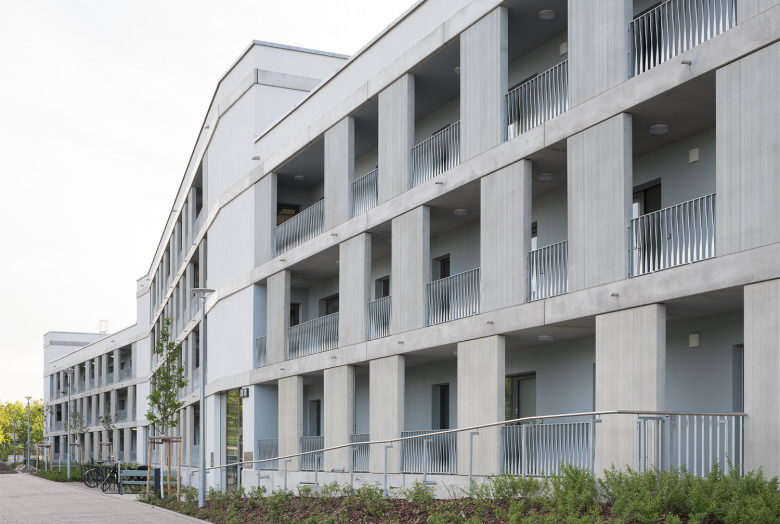 Ein markantes, dem abgeknickten Straßenverlauf angepasstes Gebäude, bildet das Tor zum Viertel. Dahinter entfaltet sich ein lebendiges Wohnensemble: Unterschiedliche Wohnformen gruppieren sich um gemeinschaftlich genutzte Grünflächen und schaffen so einen Ort, an dem Menschen aller Generationen zusammenkommen – mitten im Grünen, mit Raum für Begegnung und Austausch.