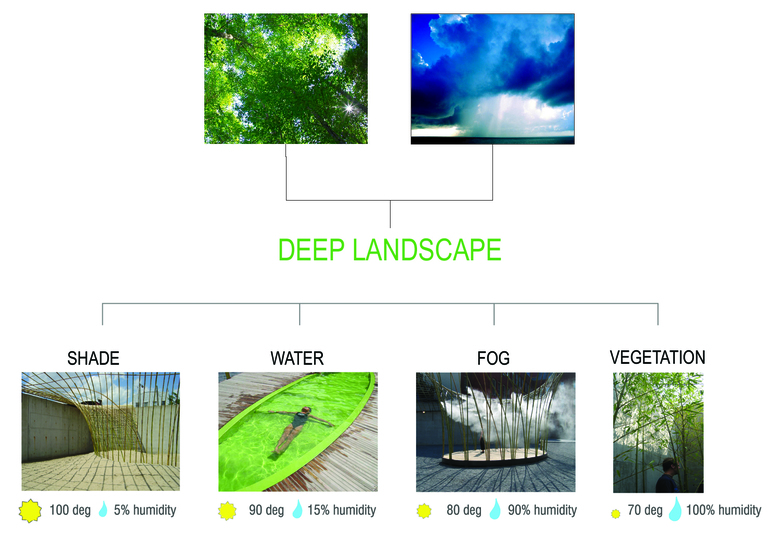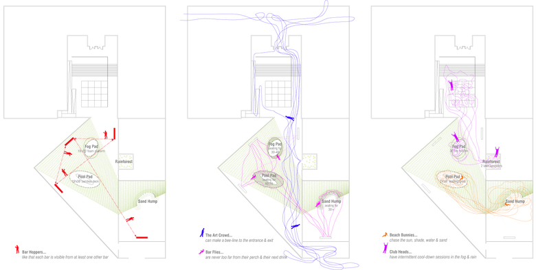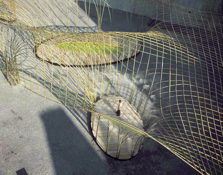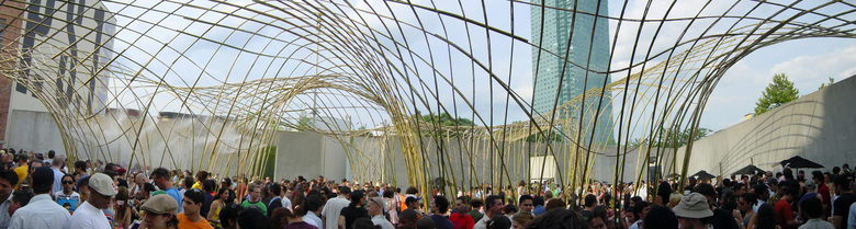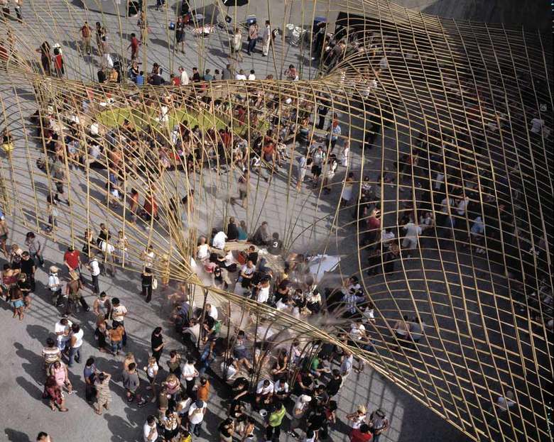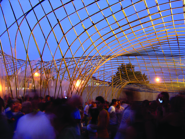 Canopy was a temporary structure built with green bamboo in the courtyard of P.S.1/MoMA, a contemporary art and music venue whose weekly Warm Up music parties attract 8,000 revelers every Saturday in the summer. Overall, Canopy was host to more than 100,000 visitors during its five months of existence, during which time it underwent a slow transformation as the freshly cut green bamboo turned from green to tan. This rapid transformation emphasized Canopy’s brevity, allowing visitors to experience the effects of time in a direct and tactile way. Dips in the canopy defined rooms open to the sky, each with a distinct climatic environment for different modes of lounging. Canopy is the first documented structure built of green bamboo.