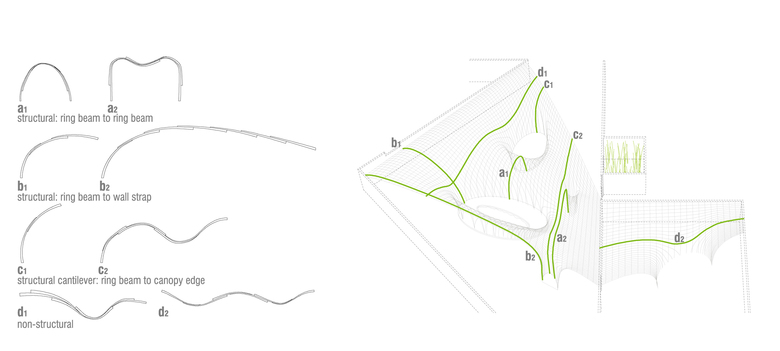 Canopy was built in situ over a period of 7 weeks by nARCHITECTS and their team of architecture students and recent graduates. Prior to construction, they spent 6 weeks on site testing each arc type to determine the maximum span, minimum bending radii and overlap dimensions. The structure utilizes 30,800 linear feet of freshly cut green Philostachys Aurea bamboo, spliced and bound together with 37,000 linear feet of stainless steel wire. Steel ring beams with welded pipes (into which the bamboo was inserted on the ground) and steel wall straps with welded pipes (into which the bamboo was inserted above the walls) were primarily fabricated off site during this testing period and installed prior to erecting the bamboo. Students used a cad/cam foam cutter to cut the undulating underwater topography of the wading pool out of 38 pieces of EPS foam, which were glued and sprayed with Polyurea on site. The initial order of 1,100 bamboo poles was chopped, cleaned and shipped from Georgia in one week, so that it arrived as fresh as possible upon delivery. Once on site, the poles were stored in racks, covered with UV resistant tarp and watered twice a day to keep them green and flexible.