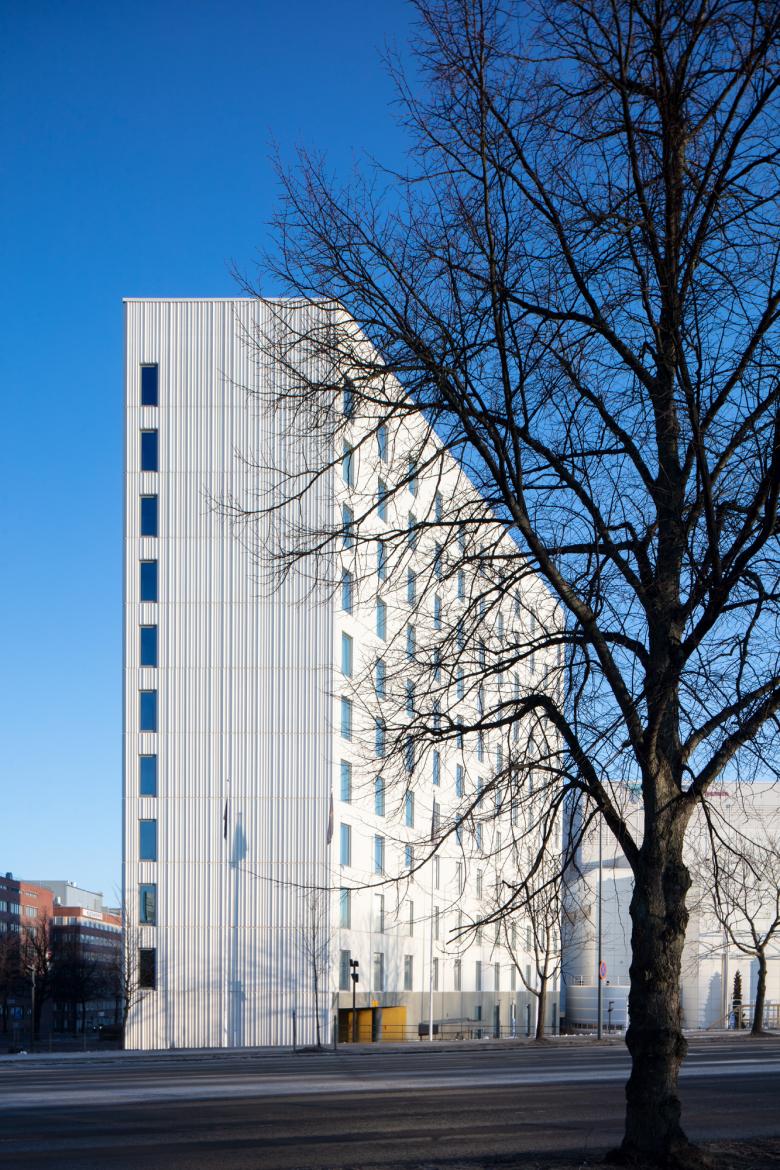 The new Courtyard by Marriott Hotel with 11 above ground floors is a high-quality addition to the Tampere cityscape. The hotel and its next door neighbor, the Tampere Hall Concert and Congress Centre, comprise a formal yet natural architectural entity. The hotel also strengthens the connection between Tampere Hall and the main building of the University of Tampere on the opposite side of the street.