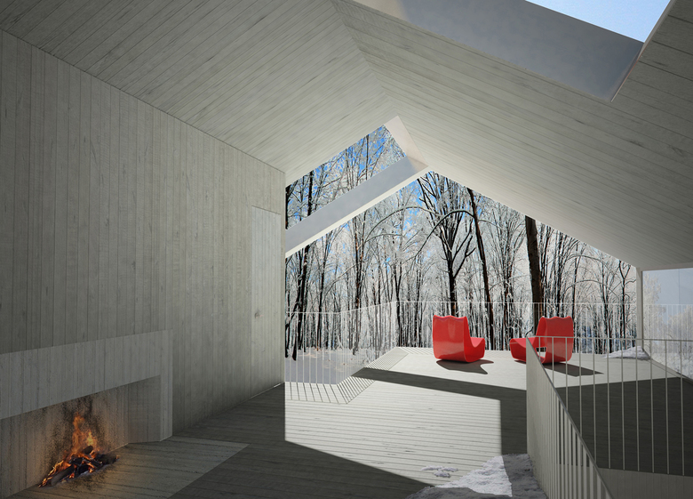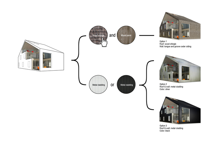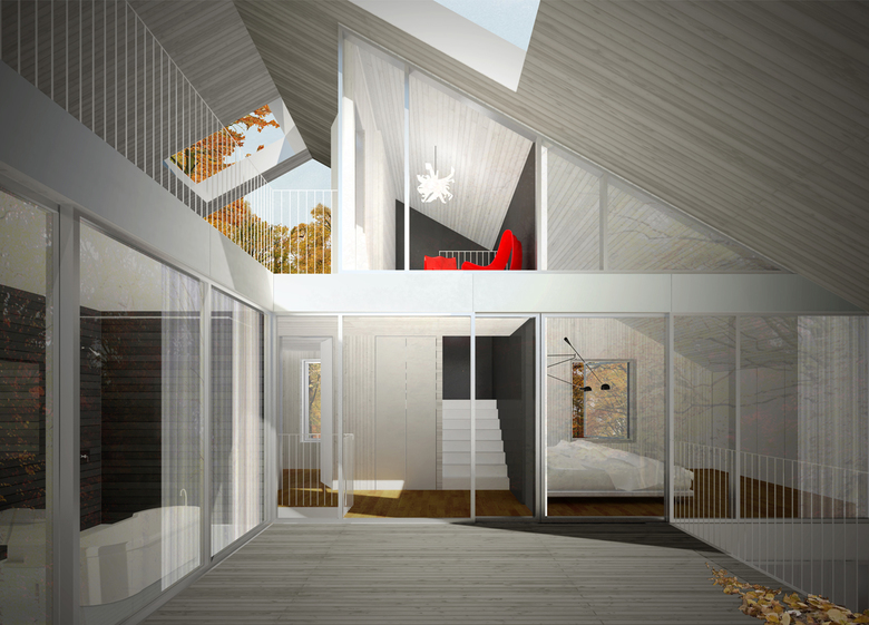While the predominant materials in both the interior and semi-exterior spaces are wood and glass, the roof and facades can be customized to accommodate local climatic and construction contexts. Two basic models, wood shingles and metal siding, are suggested in the renderings but other options can be customized directly by nARCHITECTS. For unique site or climatic conditions, nARCHITECTS can also provide mirrored versions of the house (mirrored on either axis), at additional nominal cost (contact the office directly).