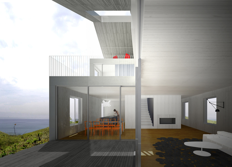 The interior of the house is luminous and simply laid out, with flowing spaces on the ground floor, and three bedrooms and two baths on the second. In combination with a series of large standard operable windows on the long facades, the glazed terrace doors and large fixed glass panels leading onto the semi-exterior terraced spaces provide dramatic and continuous connections with the outdoors. Clerestory glazing in the master bedroom and various other spatial conditions result in a simple house with a wide range of experiences, light conditions and moods.