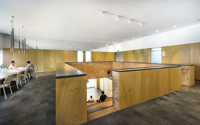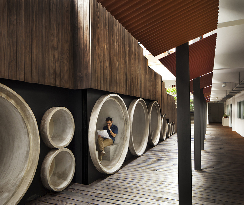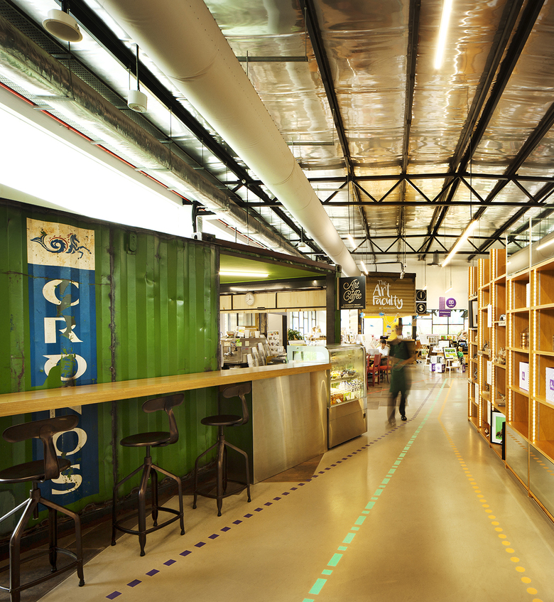 The new Nest building is anchored at the main pond and serves as a beacon, drawing pedestrian flow through the new linkways. The architectural expression and finishes are continued at the existing buildings as facade, canopies and surfaces. A timber terrace is laid over the courtyard at the Playground, stepping down as an amphitheatre with integrated ramps. The terrace continues under and past the building as a balcony overlooking activity islands and as a garden trail connecting to the adjacent housing precinct. Pre-cast concrete pipes are inserted below the amphitheatre as resting nooks. The open space between the Village Green and the Hive is reactivated as a garden yard with re-purposed sea containers as bridges, follies and meeting rooms loosely scattered with recycled oil drum planters. 'Up-cycling' continues as interior design features in the Art Faculty and Hive.