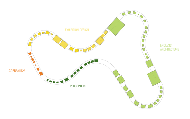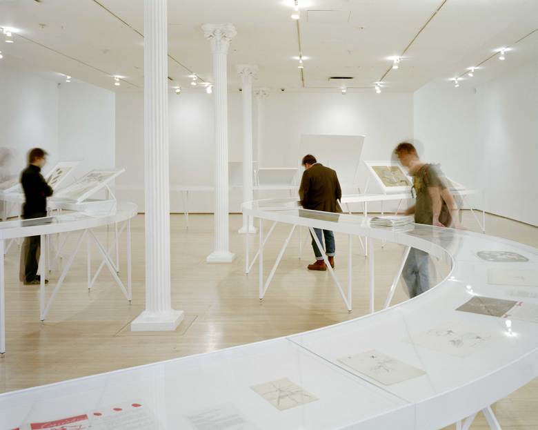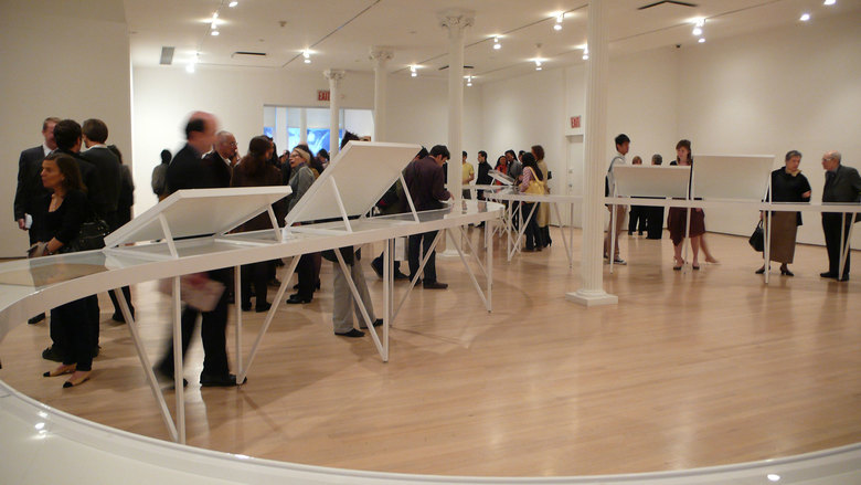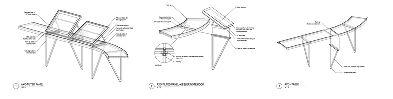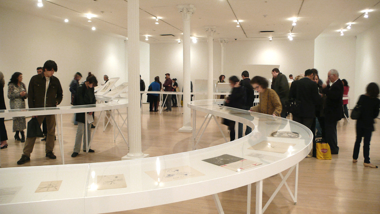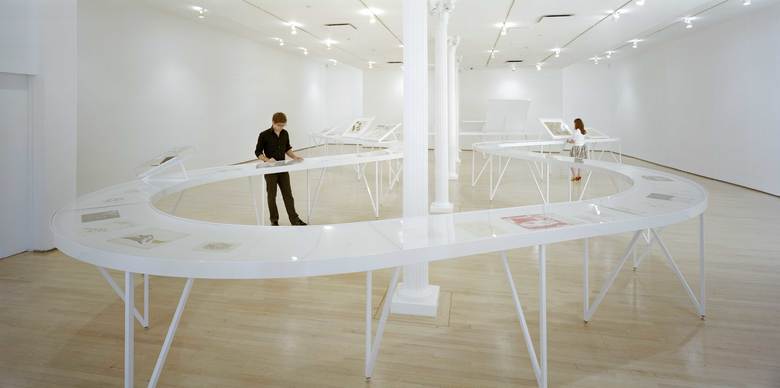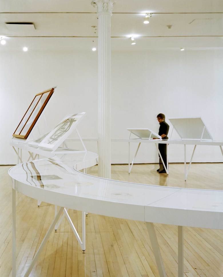 For the exhibition “Frederick Kiesler: Co-Realities” at The Drawing Center in New York City, a 144 foot long table meanders through gallery, displaying 70 drawings and 1 notebook in an endless loop. Larger drawings are displayed on tilted panels, causing viewers to adjust their viewpoints. The walls of the gallery were left blank. The table is comprised of reconfigurable modules made with CNC milled aluminum, acrylic, and mdf, all painted white.