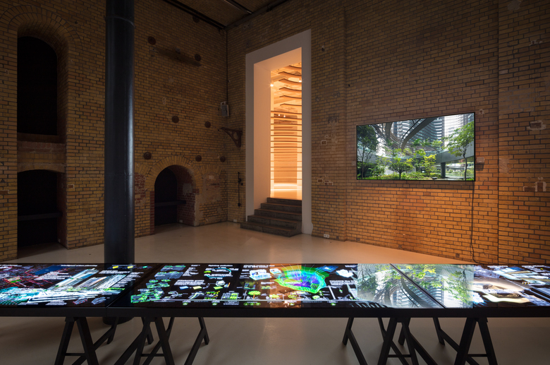 The organic shape of the building complex with its iconic louvres, and the generous planting, contribute to an improvement of the microclimate and increase biodiversity. Inspired by Asian paddy field terraces, the green center formed by the four towers—with its multi-story three-dimensional gardens—reflects the diversity of tropical flora and creates a new habitat. The compact and efficient layout design is complemented by energy-saving ventilation systems, highly effective external solar screening devices, and glazing that reduces solar radiation into the building. A space-filling sculpture is the central exhibit in the Aedes Architectural Forum; it models the deliberate design of the building shape so that it can be fully appreciated. A documentary film of the building by architectural photographer HG Esch, interviews with project participants, and explanatory diagrams of the project provide visitors with new ideas for architecture in mega-cities.