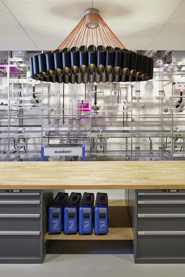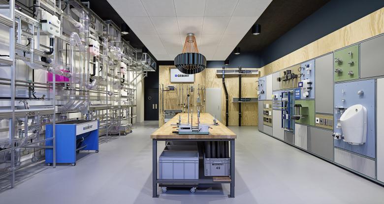 Seit 2002 setzt sich Bureau Hindermann intensiv mit den innenarchitektonischen Anforderungen des Geberit Informationszentrums am Hauptsitz in Jona auseinander. Diese Erfahrungen nutzten die Designer bei der Neukonzeption des Informationszentrums Lausanne, das nun ebenfalls in neuem Glanz erstrahlt. Es umfasst eine Ausstellung, zwei Theorieräume, einen Praxisraum sowie eine Cafeteria – und überrascht mit einer Toilette, die sich als unendlicher Spiegelraum entpuppt.