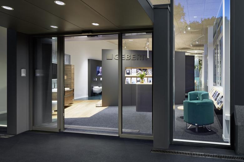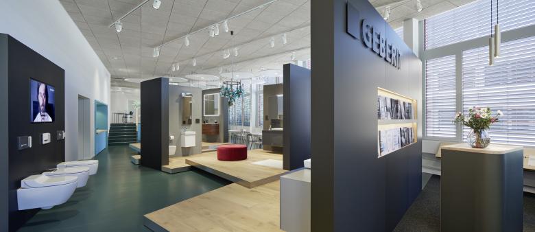 Die Informationszentren richten sich neben Fachleuten aus dem Sanitärbereich auch an Architekten und geschäftliche Endkunden die sich für die breite Produktpalette von Geberit interessieren. Die Fassade des Indust- riebaus im Lausanner Quartier Boveresse hat mit dem Umbau ein Gesicht und eine klare Ausrichtung erhalten. Der 160 m2 grosse Raum bleibt auf der gesamten Länge einsehbar und hat dennoch eine klare Gliederung, die eine parallele Nutzung der verschiedenen Zonen erlaubt.