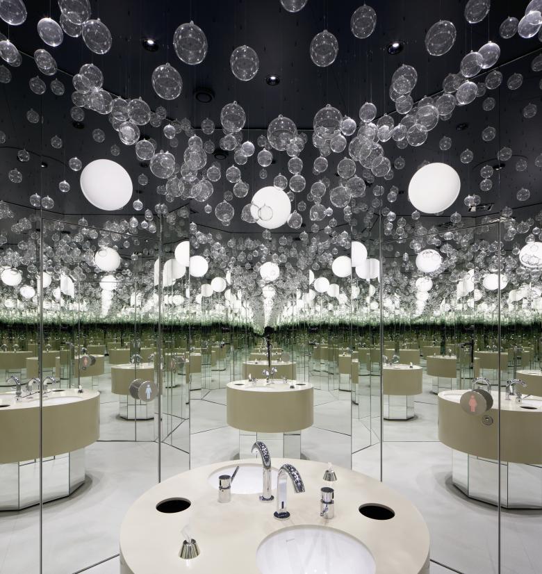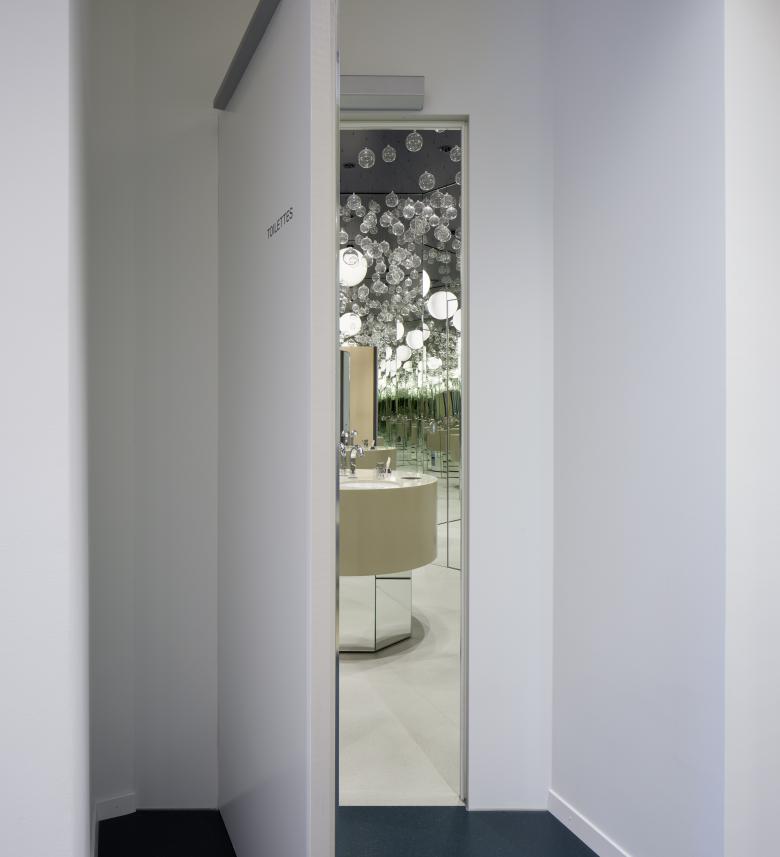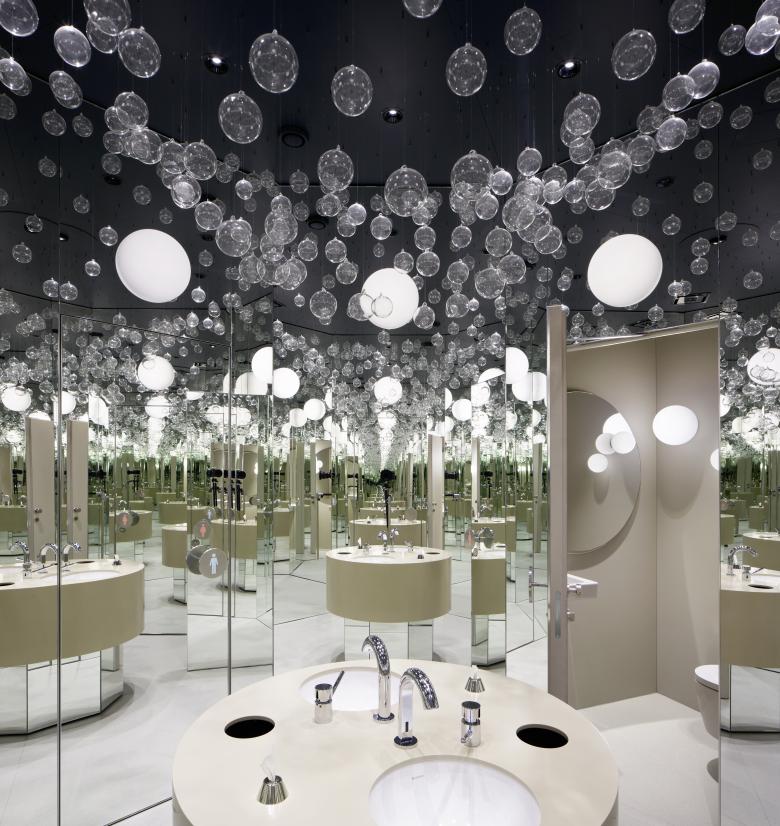 Der eigentliche Hingucker des Informationszentrums verbirgt sich hinter der schlichten Automatiktür zu den Toiletten: Der Vorraum mit zwei Waschbecken offenbart beim Betreten einen achteckigen Spiegelraum, der eine unendliche Spiegelung erzeugt, und an der Decke schweben über 200 Seifenblasen aus Glas. Das stille Örtchen, das die poetisch-verspielte Handschrift von Bureau Hindermann trägt, bietet den Besucherinnen und Besuchern ein ganz besonderes Raumerlebnis und regt zur Reflexion und zum Gespräch an.