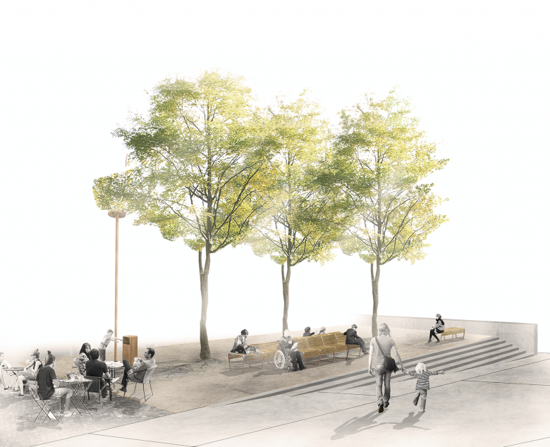 Diese Besonderheiten des Ortes werden aufgespürt und behutsam in die Neugestaltung integriert oder mit einem Gegenstück gestärkt. Der besondere Fokus liegt hier auf der Rückbesinnung des Ortes auf seine Verbindung zum See. Verschiedene gestalterische Mittel stärken den ‚Seeblick’. Blicke werden gerichtet und Zugänge, wie das Bächergässli neu ausgerichtet. Zwischen dem Dorfplatz und dem See, über die Bahnlinie, die den früheren Ortsrand markiert, hinweg, wird durch Blicke die alte Verbindung neu interpretiert wiederhergestellt.