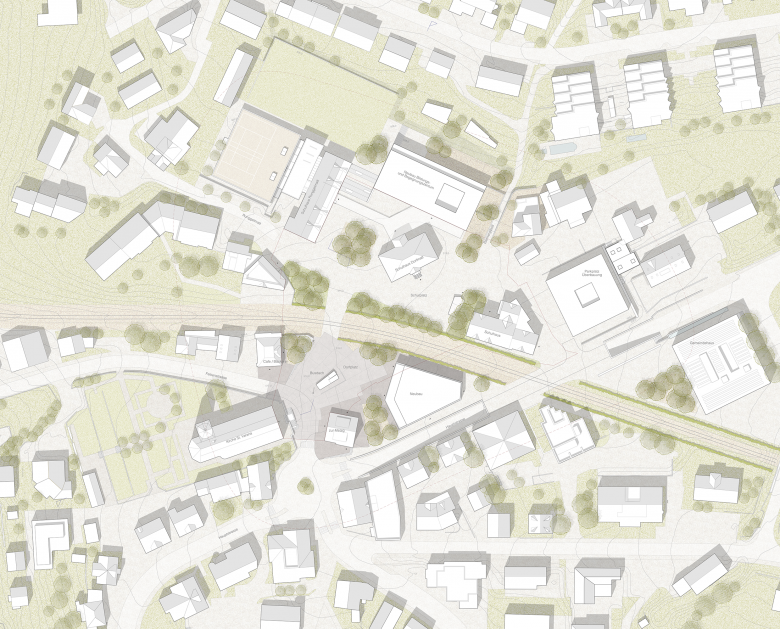 Der Dorfplatz bildet das Rückgrat des öffentlichen Raumes. Er bildet einen Ruhepunkt im Fluss und in der Dynamik des vom Strassenverkehr dominierten Dorfzentrums. Die topographische Gesamtlage ist auch in der Platzfläche ablesbar. Die Platzgrundform mit den flankierenden Bauten, gewährt durch jeden Standort wechselvolle, harmonische Perspektiven auf die Gebäude und weite, inszenierte Ausblicke in die umliegende Landschaft und zum See.