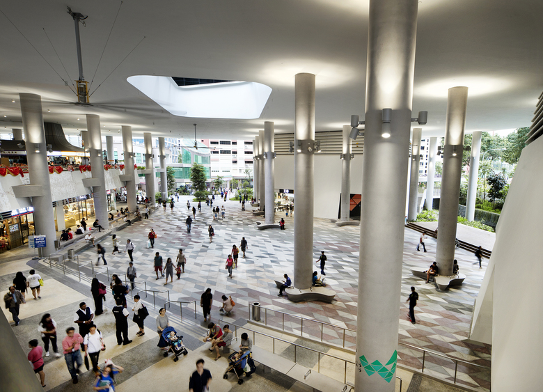 The People’s Plaza is a fully public, porous and pedestrianised ground plane, designed as a community living room, within which the public can participate in organised events, join in the season’s festivities, shop, or eat at the hawker centre on the 2nd storey. The breezy tropical plaza is shaded and sheltered by the Medical Centre above, allowing activities to continue regardless of rain or shine.