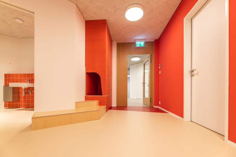 Die grosse Farbpalette des Bodenbelages erlaubte zudem das Farbkonzept der Architektin umzusetzen und den Kindern eine kreative und farbenfrohe Spiel- und Lernumgebung zu gestalten. Die bestehenden Identifikationsfarben der Krippengruppen, Rot, Grün, Gelb und Blau wurden im Neubau übernommen. Um das Farbkonzept auch für die Kindergärten einzuhalten, wurden die Farben Orange und Violett ergänzt.