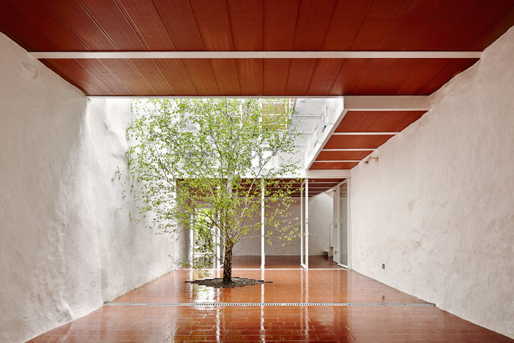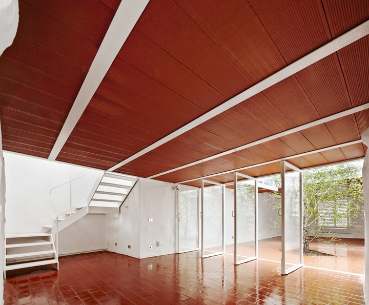 Surrounding the courtyard, 4 floors are built at different levels. Each of these contain a single use; kitchen, living room, bedroom 1 and bedroom 2. The courtyard is dominated by a birch tree, so that the living room and kitchen are among the green interior and the green garden. The stairwell, located in the living room and kitchen, prevents circulation near the bedrooms, which are located between the courtyard and the main facade. Each room has its own bathroom, fully open to the patio and with dual access from the room and the corridor itself. The lining of the bathrooms is white gloss glazed tiles that reflect the tree leaves and the light of the courtyard, doubling the effect of the tree’s presence. There’s a metal framework walkway that goes around the courtyard, allowing a double inner-outer circulation. Besides functioning as a circulation element, it can also serve as a bench where you can sit, extending the interior-courtyard relation. The structure and construction are overwhelming in its simplicity. The work shows its pure materiality and deliberately contrasts with irregular textures of rammed-earth and stone, which have been whitewashed. It has sought an atmosphere where the red color of the ceramic and the intense green birch predominate, and it's the light that bathes these materials through various shades of the walls and floors throughout the day. The ceramic material itself gives us the desired texture and warm color, so paintings or false ceilings were unnecessary. The entire ground floor is covered by a large blanket of red tiles, which goes along with the ceiling and defines the basin of the tree. In the rear of the ground floor is the summer living area. This room is designed so that it can be fully opened to both the courtyard and the garden, to enjoy the cool breeze in the summer when the sun hits hard.