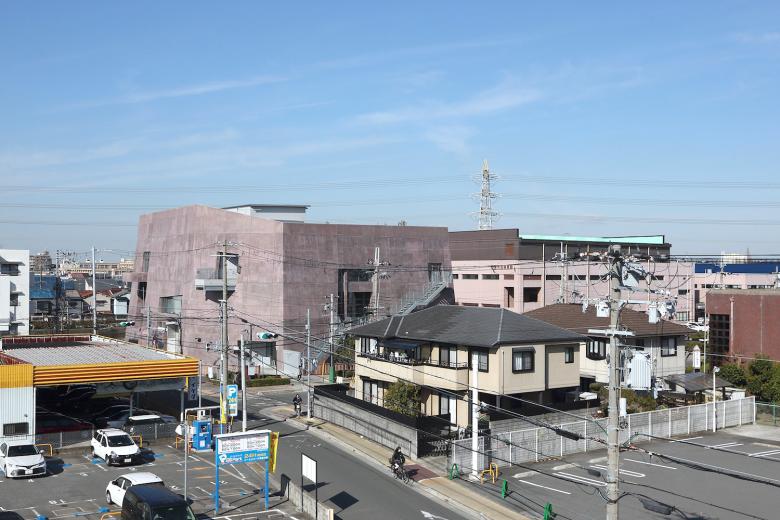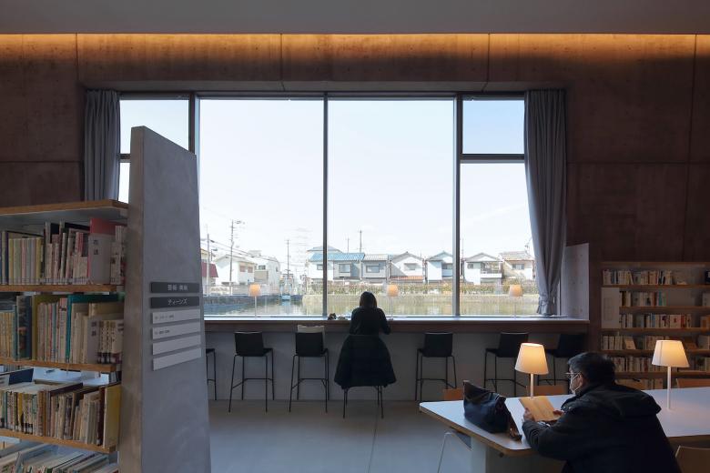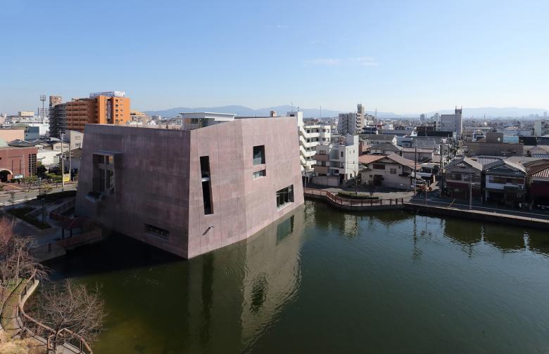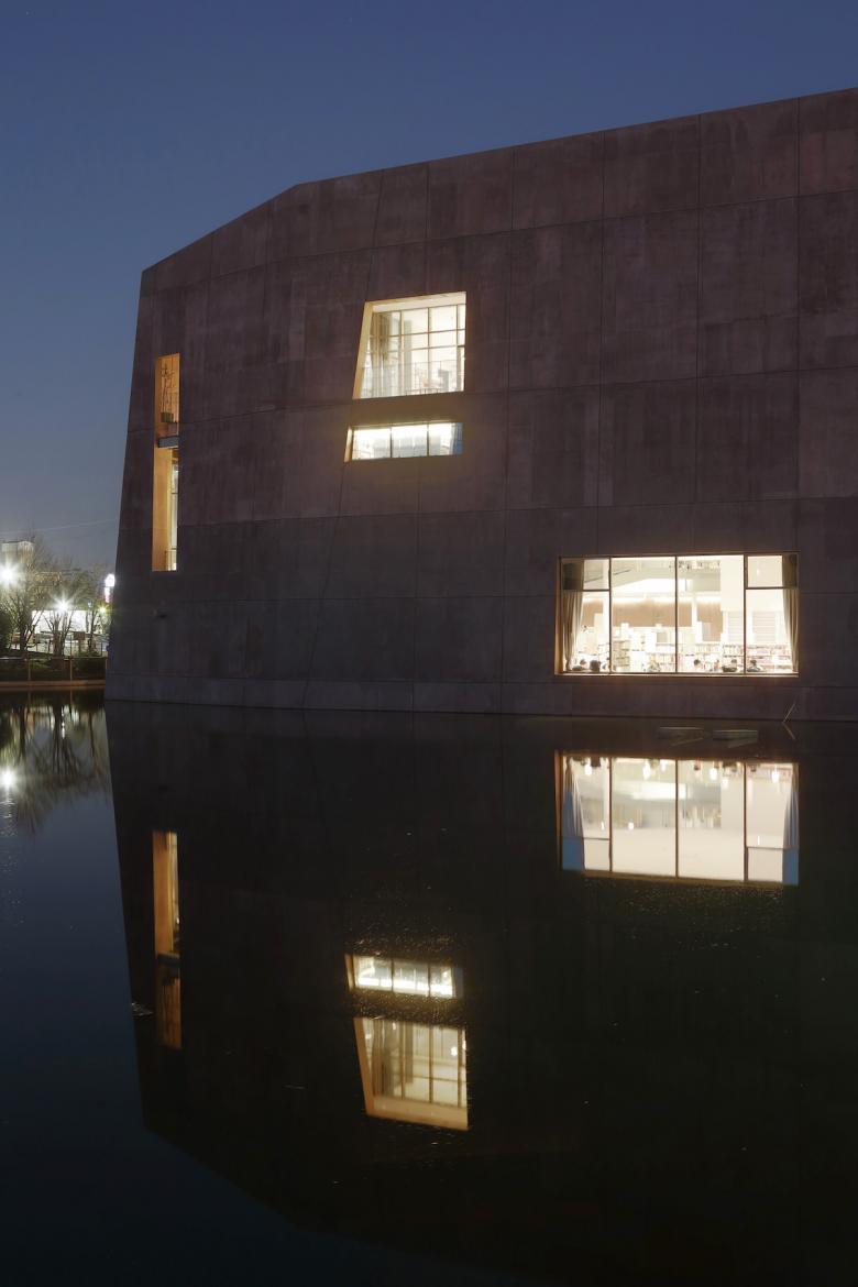 松原市には、農業用水を確保する為のため池や住宅地の中に点在する巨大な古墳の風 景があります。これらは、人間の手でつくられた「人工物」でありながら、永い時間を経ることで、あたかも「自然物」のように街の日常的な風景となっています。本計画は、ため池の一画が敷地として設定されており、これを埋め立てて建物をつくることが想定されていました。近年では建設用地を確保するための一つの手法となっていると聞きます。しかしながら、長い時間軸でこの場所のことを想像すると、ため池という環境を受け入れながら、その中に力強く建ち続ける建築をつくることこそが、街の歴史に寄り添っ ていくあり方であるように思われました。元来、水と建築は相性が悪いですが、ダムや擁壁のような土木物は水と接しながら悠然と存在しています。それは単なる性能面の違いではない人工物としての存在としての強さです。そこで私達は、時代を越えていく建築として土木的な建ち方を考えるに至りました。
