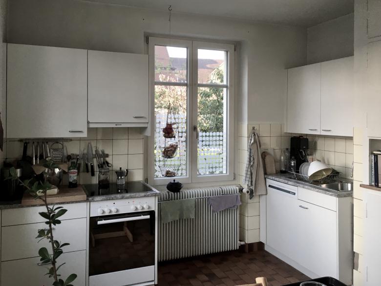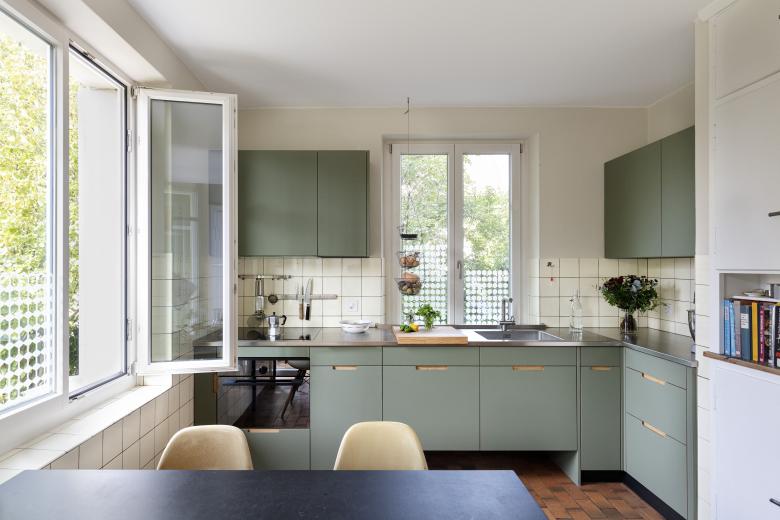 In der Küche ersetzte eine neue Einbauküche die Anlage der 1990er-Jahre. Grüner Linoleum, blassgelbe Wandplatten aus den 1940ern und roter Klinkerboden fügen sich zu einer harmonischen Komposition. Eingelassene Eichengriffe zitieren die erhaltenen Einbauschränke der Entstehungszeit.