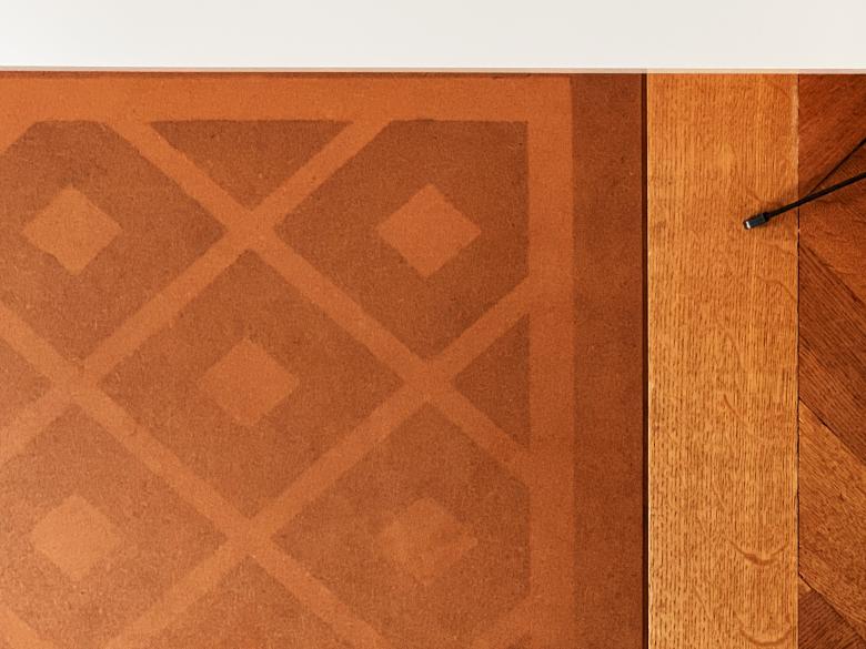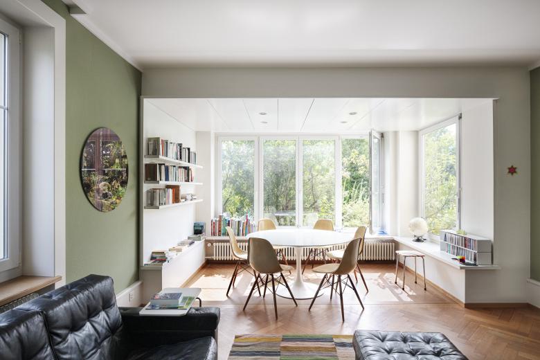 Unser Eingriff beschränkte sich auf das Erdgeschoss und blieb zurückhaltend. Die Einhausung der Laube blieb bestehen, der alte Parkett wurde freigelegt, die Wände in kräftigen Farben gefasst – Anklänge an die Obergeschosse. Im Wohnzimmer stellten wir Fenstereinfassungen und Simse wieder her; neue Sockel- und Deckenfriese verbinden Alt und Neu.