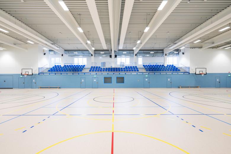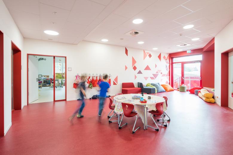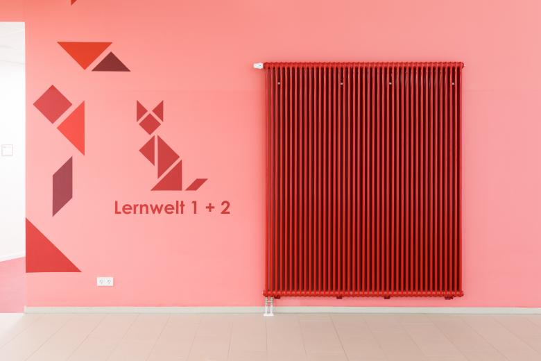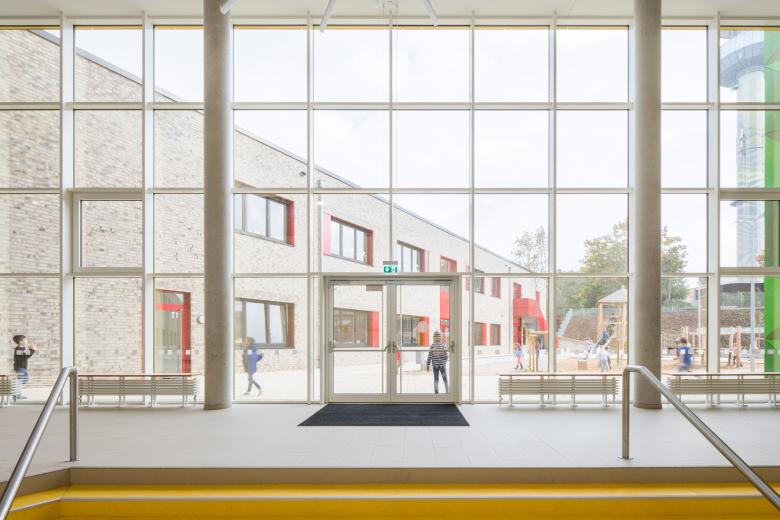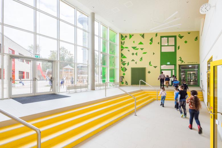 Auch im Inneren des Neubaus finden sich die farbigen Formen wieder. Sie begleiten die Kinder durch ihren Schulalltag und unterstützten bei der Orientierung im Gebäude. Der Eingangsbereich ist von einer großflächigen Verglasung geprägt, die das Herzstück des Gebäudes als lichtdurchfluteten Raum vielfältig nutz- und erlebbar macht. Die Lernwelten bieten mit unterschiedlich offenen Bereichen, Differenzierungs- und Rückzugsräumen verschiedene Raumqualitäten.