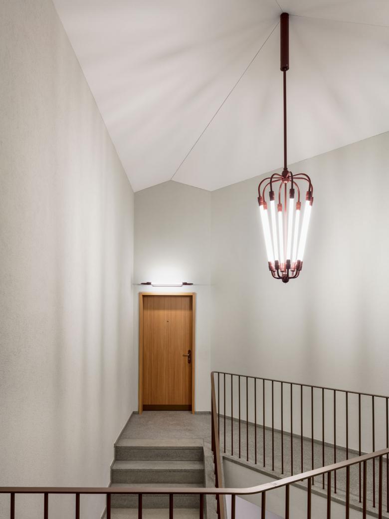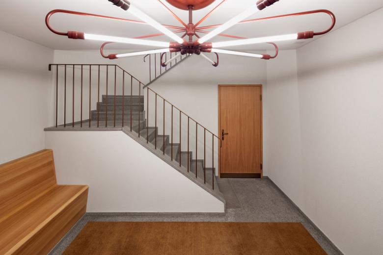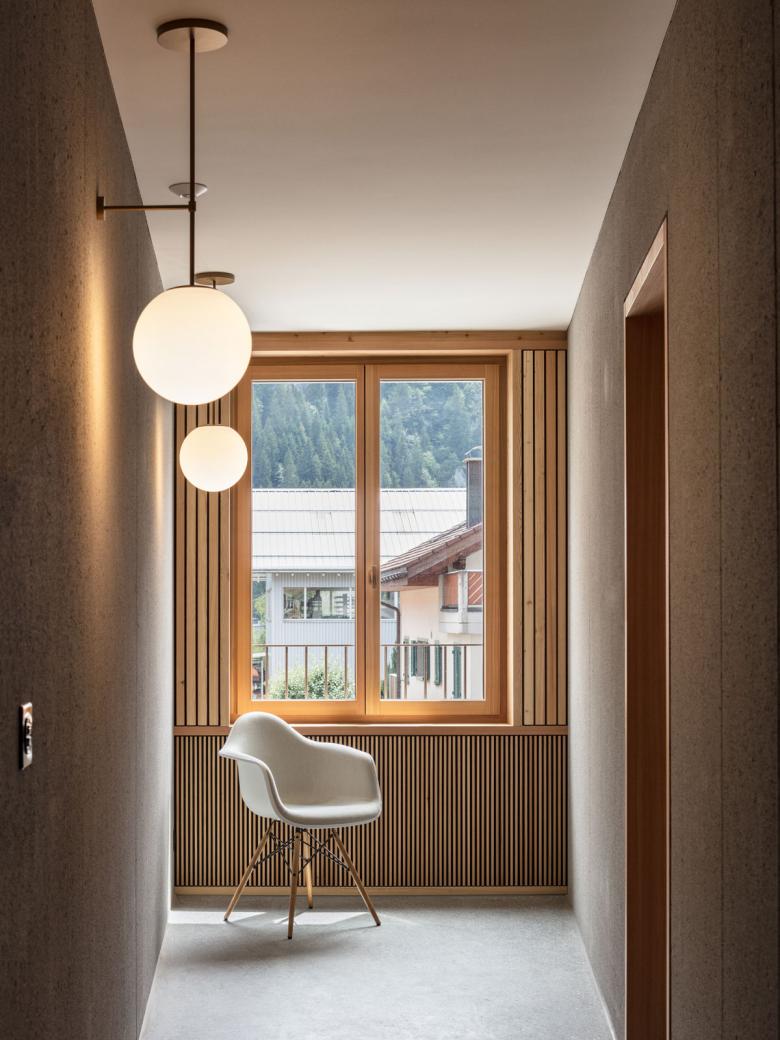 Die Gestalt der neuen Raiffeisenbank nimmt Bezug auf die Baukultur des Ortes. Mit Sorgfalt integriert sich der Neubau in den Dorfkern von Unteriberg, den die Einwohner als neuen Bestandteil der Dorfmitte wahrnehmen. Zu jeder Seite der polygonalen Grundform sind orthogonale Räume vorgesehen. Zwischen ihnen spannt sich ein Raum auf, der als Erschliessungs- und Begegnungszone dient. Die Beleuchtung spricht eine ungewohnt wohnliche Sprache. Eigens entwickelte Leuchten bilden prominente Lichtobjekte oder zurückhaltende Pendelleuchten.