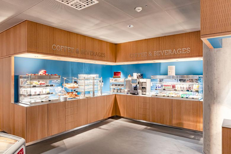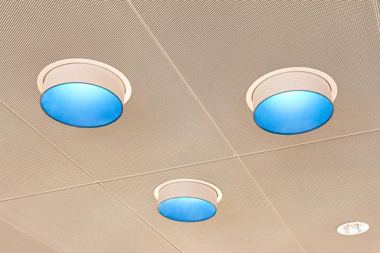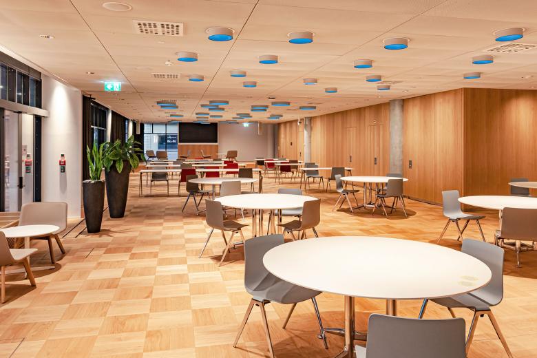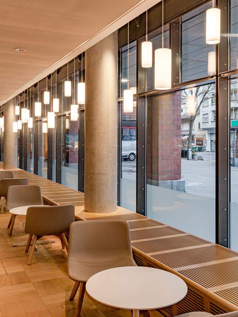 Im Rahmen des Mieterausbaus wurden für die UBS Schweiz neue Grossraumbüros geschaffen. Ergänzend steht den Mitarbeitenden im Erdgeschoss ein Restaurant zur Verfügung. Die Beleuchtung der multifunktional genutzten "Townhall" trägt dieser flexibilität Rechnung. Farblich abgesetzte Halbeinbauleuchten bilden moderne Lüster, die eine homogene Grundbeleuchtung schaffen, im Gästebereich dienen sie als Akzentbeleuchtung. Die entlang der Fassade positionierten Pendelleuchten bilden ein attraktives Gegenüber zu den aufgehellten Rückwän