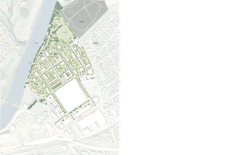 In dieser Vision werden die unterschiedlichen Charaktere - Flussraum und Industrie - in einer neuartigen, hochwertigen Wohn- und Arbeitsumgebung zusammen geführt. Die Identität des zukünftigen Riverside-Quartiers entwickelt sich aus der Verzahnung des grosszügigen Freiraums mit dem Wohngebiet bis tief hinein in das Arbeitsgebiet. Sie baut auf der Grundstruktur und den markanten Gebäuden des Industriegebietes auf und entwickelt sich zu einer feinkörnigen und abwechslungsreichen Wohnumgebung, mit einer grosszügigen, an der Aare gelegenen öffentlichen Parklandschaft.