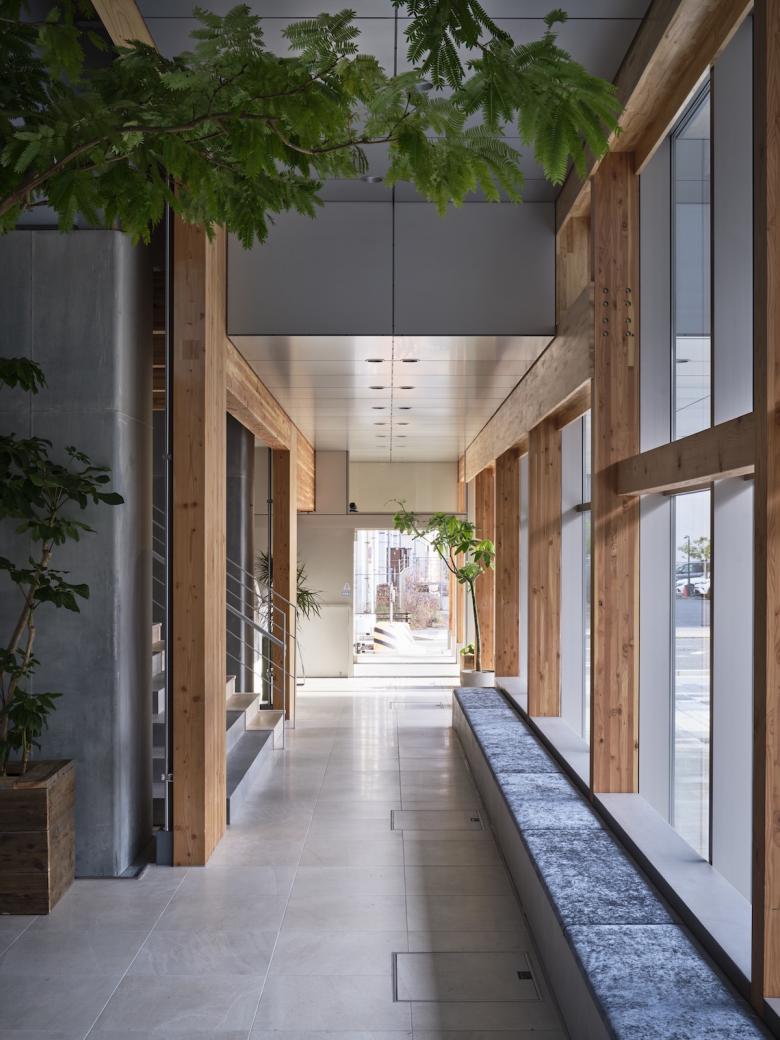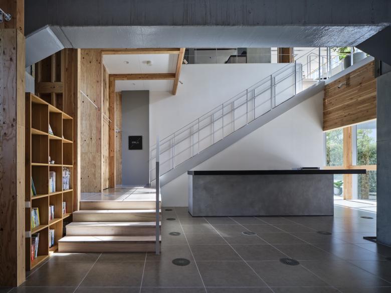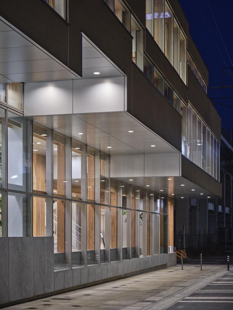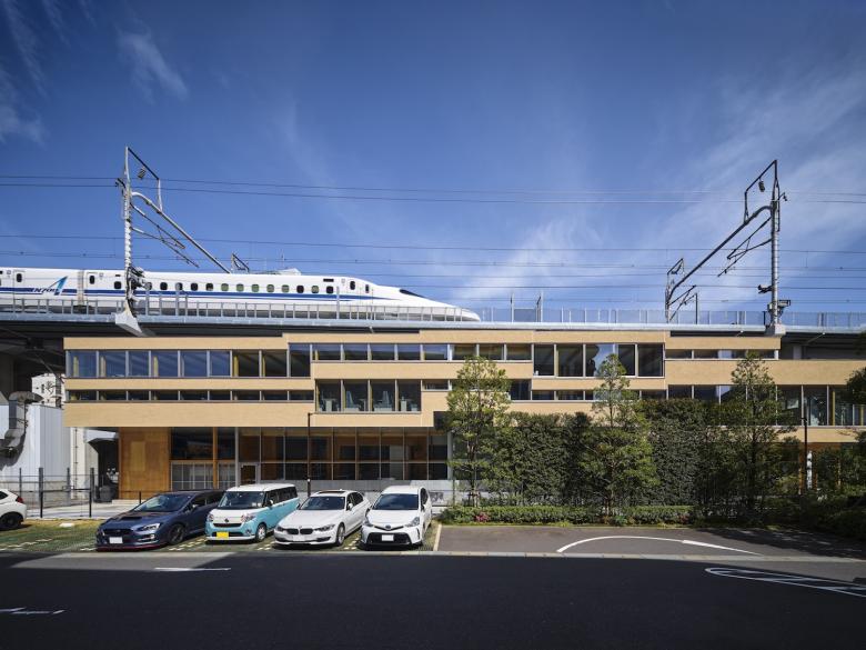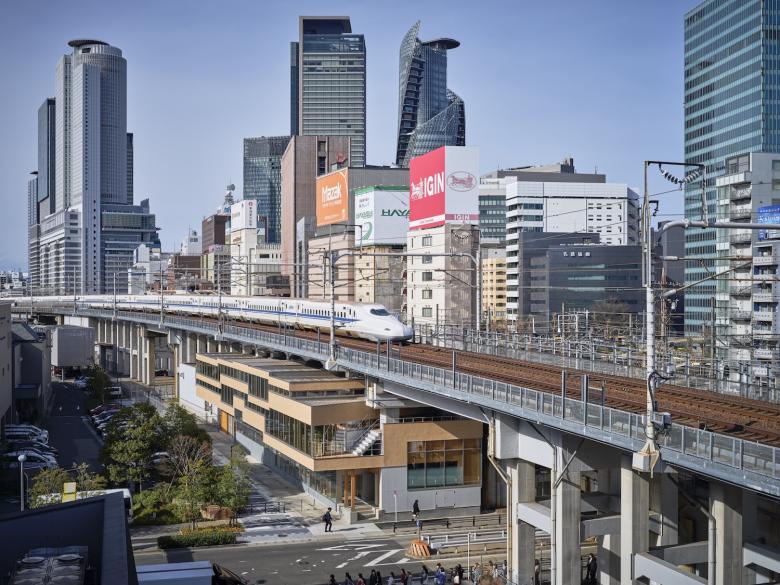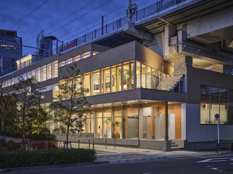 名古屋駅近傍エリアの新幹線高架橋下に建つオフィスです。高架橋下は、都市の中で広大な面積を占めながらも、柱・梁による空間的制約や構造的制約、振動・騒音などの諸課題があり、これらを乗り越えて、最大限に場所を活用することが求められました。