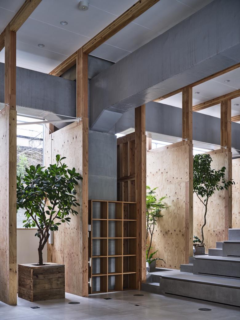 新設の木構造体は、高架橋に構造的に依存することなく、それぞれが自律的にオーバーラップする構成としました。高架と異なるリズムで自由度の高い構造を実現するために、木の積層材と炭素繊維を組み合わせた新建材「LIVELY WOOD」を採用することにより、梁せいを最小化し、ロングスパンで跳ね出しの大きな構造を可能としている。これによって、異なるレベルの分節された床が、高架の躯体フレームの中に、様々に展開する構成を実現しています。