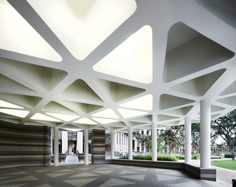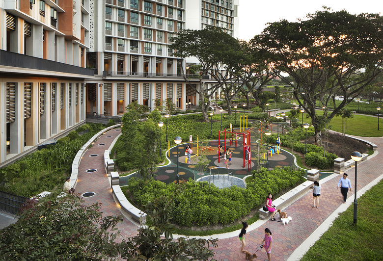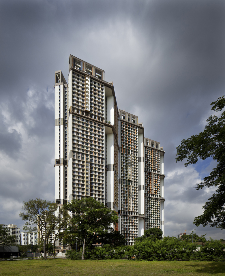Awarded a Platinum Greenmark rating - Singapore's highest and the first for public housing - the project adopts robust passive design strategies including naturally lit and ventilated lobbies, staircases, access corridors. All apartments are naturally ventilated and due to the open, airy design, a substantial proportion of units have not installed air-conditioning. Photovoltaics on the roof power the common facilities. The design is fully precast and prefabricated, reducing waste and errors on site. The design creates variety through the re-arrangement of the modules, through colour, light and shade.